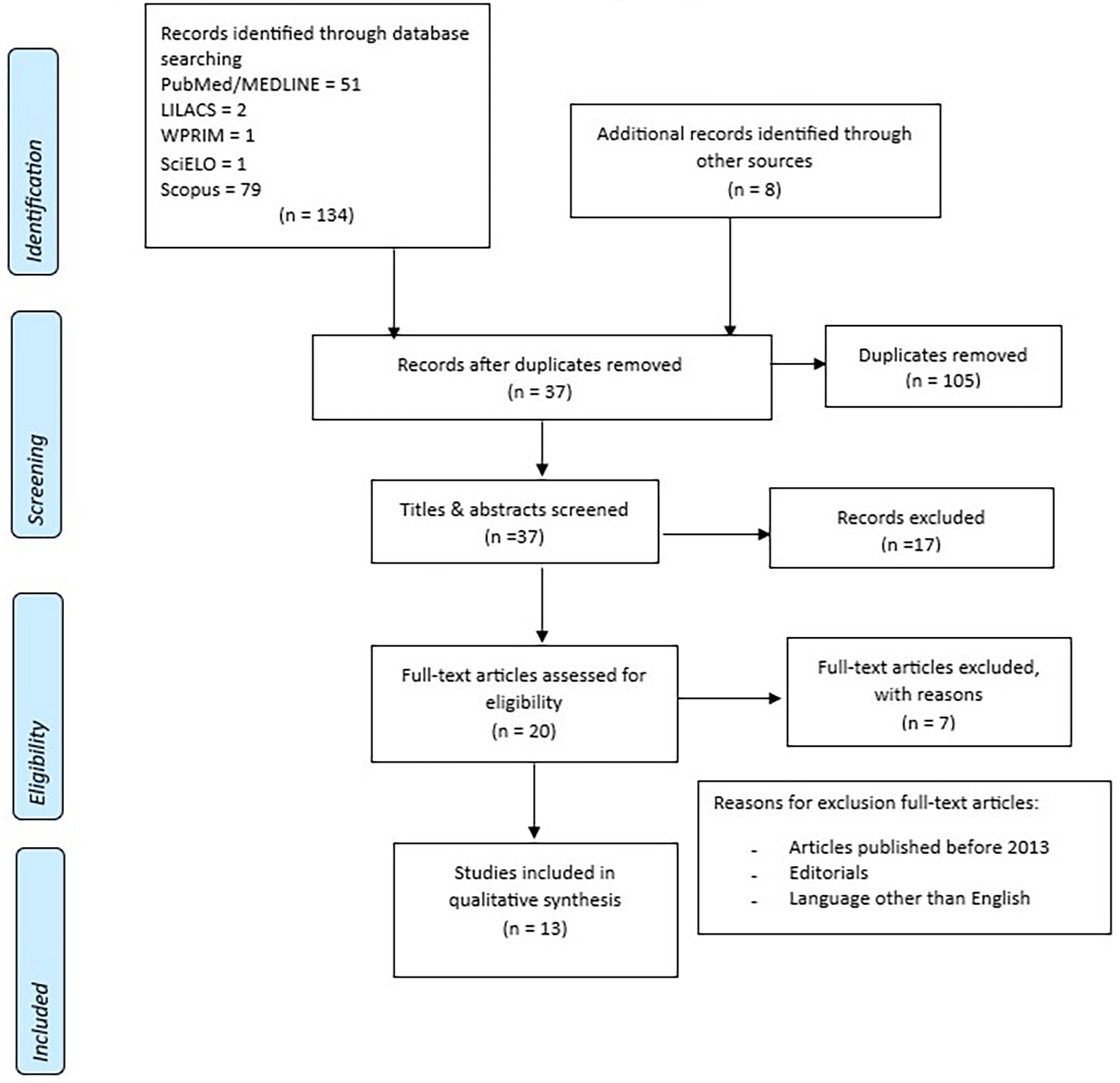 The database search resulted in 134 studies. Eight articles were included, sourced from the reference lists identified through the original database search. After removing duplicates (105), the relevant articles and publications were selected in two stages. During the first stage, the titles and abstracts of the articles were screened, and non-relevant articles were excluded.17 In the second stage, the full text of included studies was explored. Articles published before 2013, editorials and written in a language other than English were excluded.7 As a result, 13 studies were selected for a final review (Figure 1).