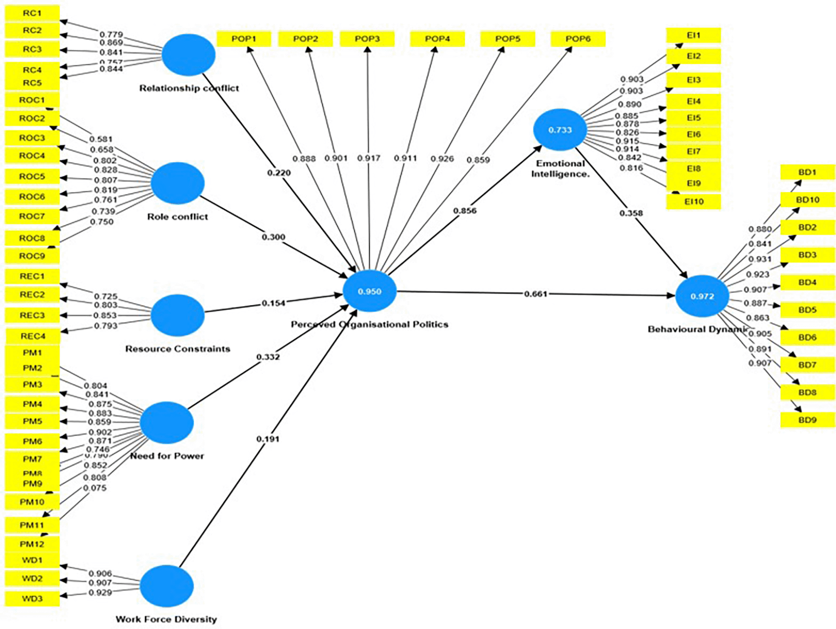 The descriptive statistics presented in Table 2 (extended data) (Sonakshi Bhatia et al., 2024b), illustrate the mean scores and standard deviations for various factors influencing organizational politics, emotional intelligence, and employee behavior within the studied context. For relationship conflict (RC), respondents reported a mean score of 3.5592 with a standard deviation of 0.92123, indicating moderate levels of friction and tension among employees, as well as frequent conflicts about ideas and work tasks. Similarly, role conflict (ROC) exhibited a mean of 3.4902 with a standard deviation of 0.84026, suggesting instances where individuals face challenges aligning with organizational roles and encountering conflicting demands. Resource constraints (REC) were perceived at a mean of 3.4575 with a standard deviation of 0.86520, indicating a moderate perception of insufficient resources hindering effective job performance. The need for power was reported with a mean score of 3.4828 and a standard deviation of.86388, reflecting perceptions regarding authority, access to information, and influence within the organizational hierarchy. Workforce diversity (WD) exhibited a higher mean of 3.7373 with a standard deviation of 1.00694, suggesting notable variations in values, goals, and objectives among employees. Perceived organizational politics (POP) displayed a mean score of 3.5230 with a relatively lower standard deviation of 0.73836, indicating moderate agreement towards political behaviors such as self-promotion and conformity to influential groups. Emotional intelligence (EI) was reported with a mean of 3.6010 and a standard deviation of 0.79514, reflecting moderate levels of self-awareness, emotional understanding, and emotional regulation among respondents. Lastly, employee behavioral dynamics (BD) demonstrated a mean score of 3.5390 with a standard deviation of 0.74679, suggesting varying degrees of intention to remain in the organization, task engagement, and energy exertion. These descriptive statistics provide insights into the perceived levels of organizational dynamics and individual attributes among the study participants.