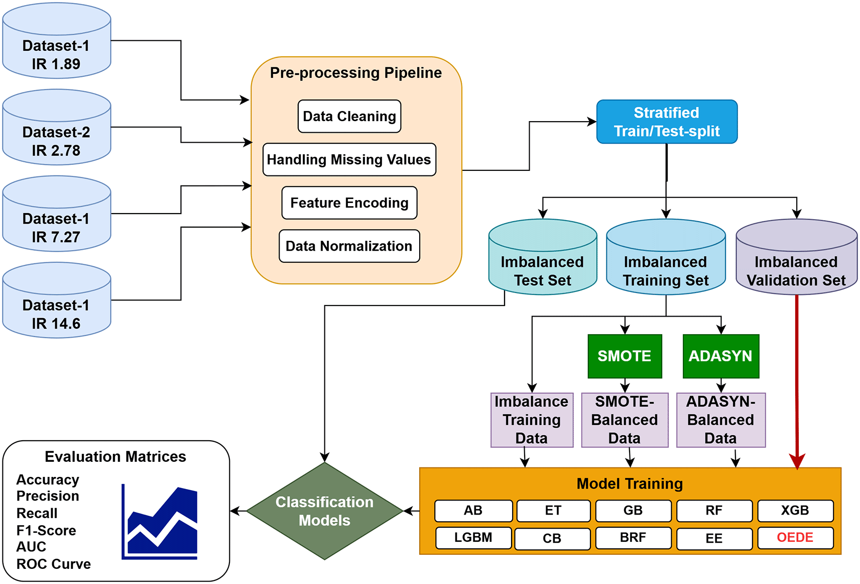 To evaluate the robustness and adaptability of the proposed OEDE model, we used four widely used public medical datasets from the UCI Machine Learning Repository, with different class Imbalance Ratios (IR), as shown in Table 2. These datasets were carefully chosen to cover a broad range of real-life situations where minority class data are clinically significant. The Pima Indiana Diabetes Dataset (IR = 1.89) includes the inception of diabetes in female patients based on diagnostic measurements. The Haberman’s Cancer Survival Dataset (IR = 2.78) has patient records for those who had undergone breast cancer surgery, aimed at predicting post-operative survival. The Thoracic Surgery Dataset (IR = 7.27) is based on predicting survival following major lung surgery for patients, considering clinical and surgical factors. Finally, the Cervical Cancer Risk Dataset (IR = 14.6) uses personal health information and screening results to assess the risk of cervical cancer. These datasets provide a range of imbalance ratios where the minority class proportion is less than 40%, offering a robust testbed for validating the effectiveness of the OEDE.