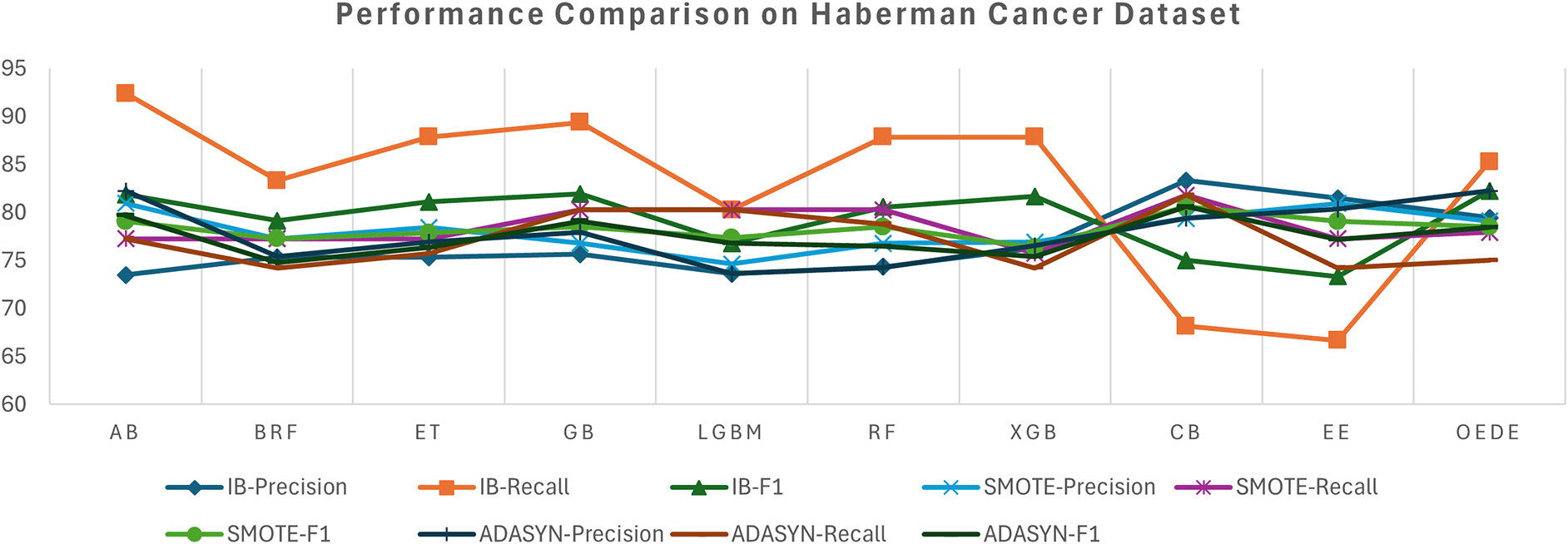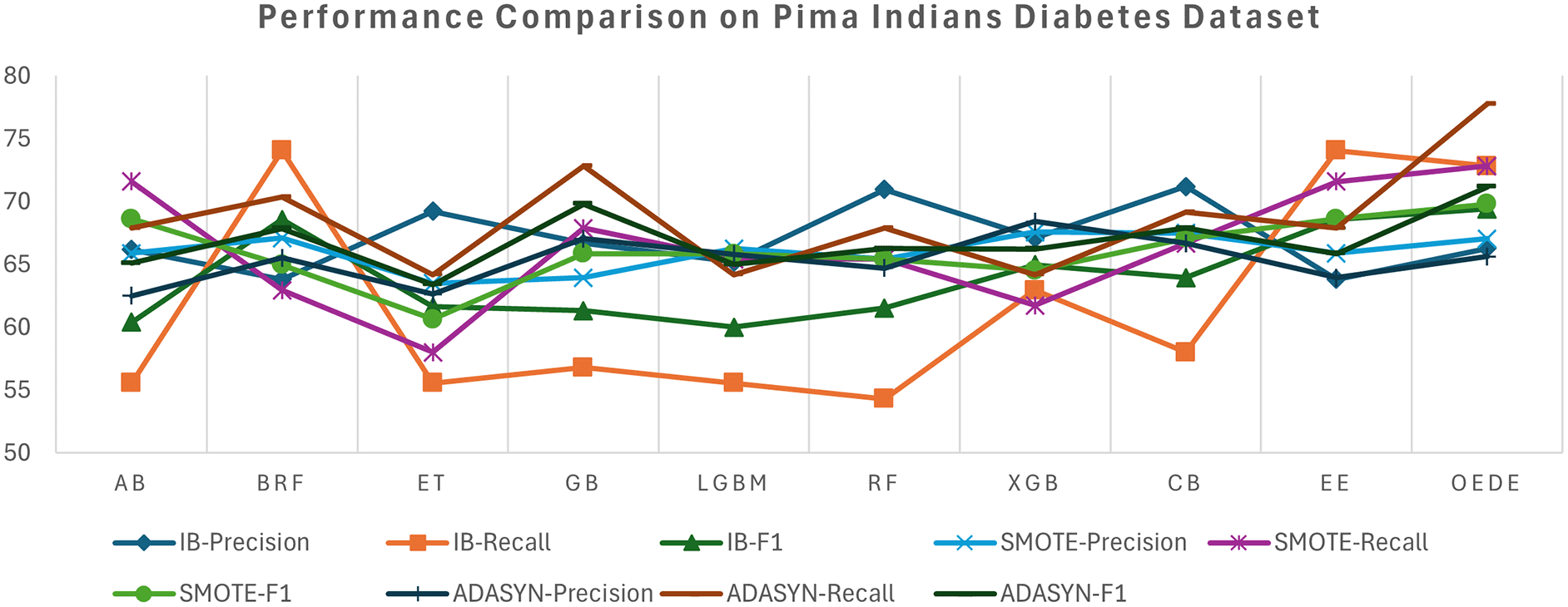 OEDE achieved a higher accuracy, AUC, and F1-score than traditional ensemble models such as RF, AB, and CB in an imbalanced dataset, as shown in Table 4. While some models show comparable accuracy, OEDE shows stability in precision and recall, leading to a better F1-score as shown in Figure 3, demonstrating its ability to detect the minority class without compromising the overall correctness. After the dataset is balanced with SMOTE, an improvement is observed in recall for most of the models, which shows that the models benefit from the synthetic sample. The OEDE maintained its AUC lead, highlighting its ability to influence informative patterns more effectively, even in a balanced dataset. Its high F1-score reflects food robustness against overfeeding for synthetic data. When ADASYN is used for data balancing, some models show instability in precision and recall, as ADASYN tends to produce harder-to-learn synthetic samples, while OEDE has a high-performance score without sacrificing stability and sensitivity.