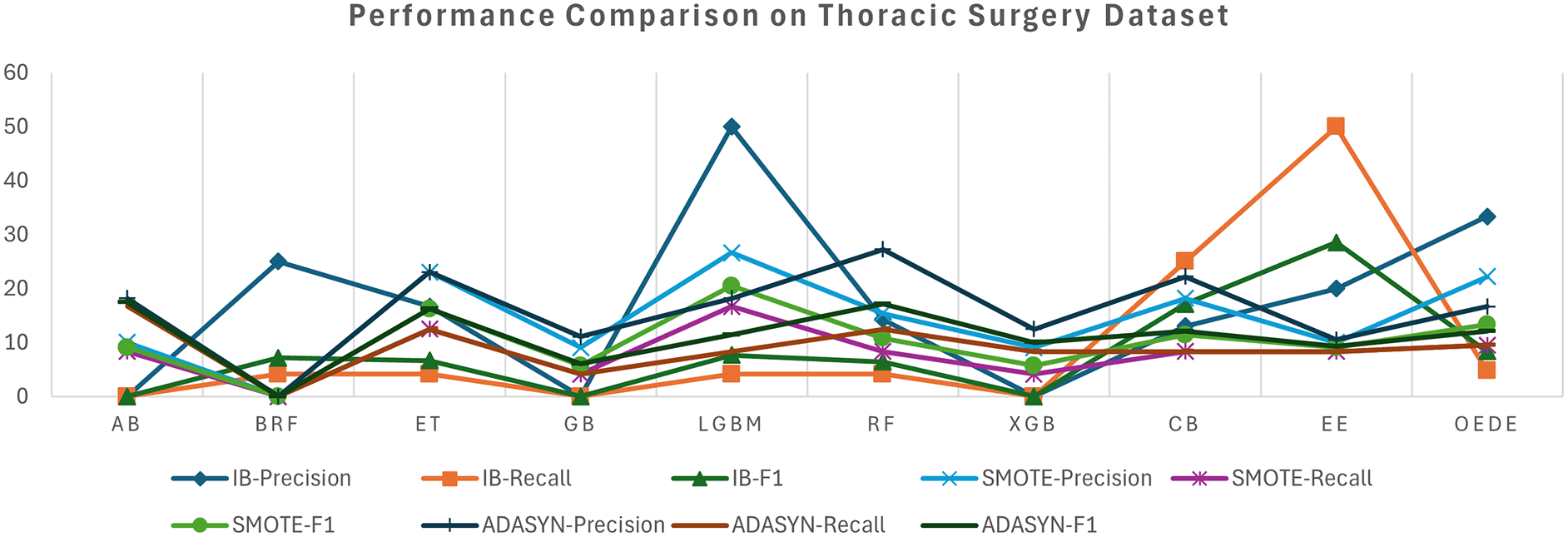 The thoracic surgery dataset showed a significant imbalance in class distribution, challenging most of the classifiers that favour the majority classes. OEDE outperformed traditional ensemble models such as RF, LGBM, and BRF in terms of AUC and F1-score, as shown in Table 5 and Figure 4, while the original imbalanced dataset was used. Although many baseline models achieve relatively high accuracy, OEDE maintains its balanced performance, achieving higher recall for minority classes and offering better overall performance. With the SMOTE-balanced dataset, most models improve recall values owing to synthetic samples. OEDE continues to display a superior performance matrix, especially the AUC value, which indicates the robustness of the model even when the dataset is balanced with synthetic data without dropping precision or overfitting. Similar to the previous datasets, the performance of the baseline models fluctuated in the ADASYN-balanced dataset, but OEDE maintained a stable performance and showed high F1 and AUC scores. This generalizability and consistent performance are possible owing to the differential evaluation-based weight optimization.