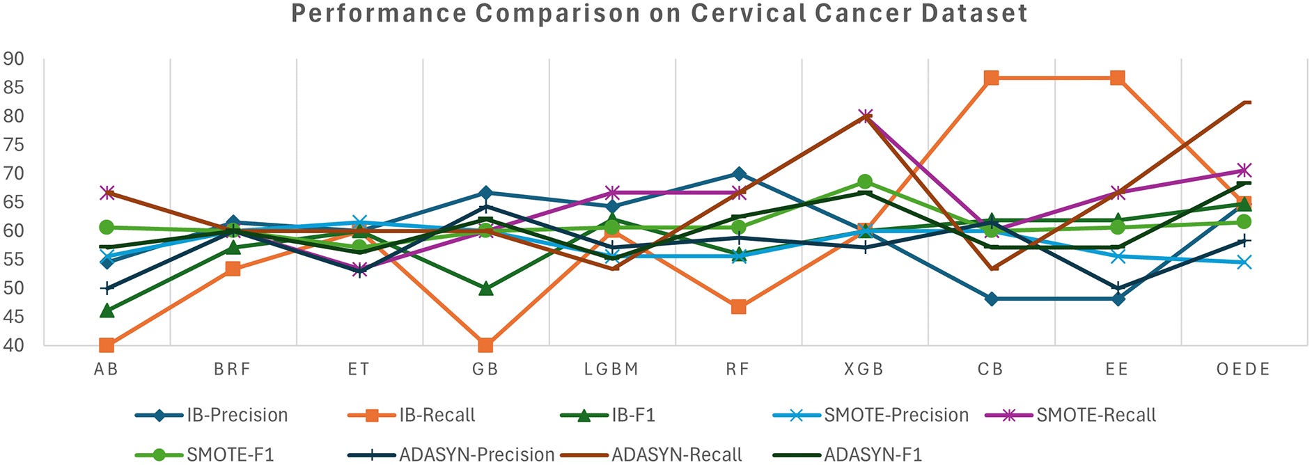The Cervical Cancer Risk dataset shows a significant difficulty owing to high-class imbalance, where high-risk cases are less than 7% of the dataset, which tends to affect the performance of the traditional model. On the imbalanced dataset, most baseline models, such as RF, ET, and CB, struggle with the minority class and show a low recall and F1-score, despite considerable accuracy, as shown in Table 6 and Figure 5. In contrast, OEDE is able to distinguish the minority class effectively owing to adaptive weighting, as reflected in the AUC and F1-score. Again, SMOTE improves the recall for all models, including OEDE, while maintaining competitive precision and achieving the highest AUC. For the ADASYN-balanced dataset, OEDE maintained high performance with the highest AUC and F1-score, supporting its resilience and generalizability.