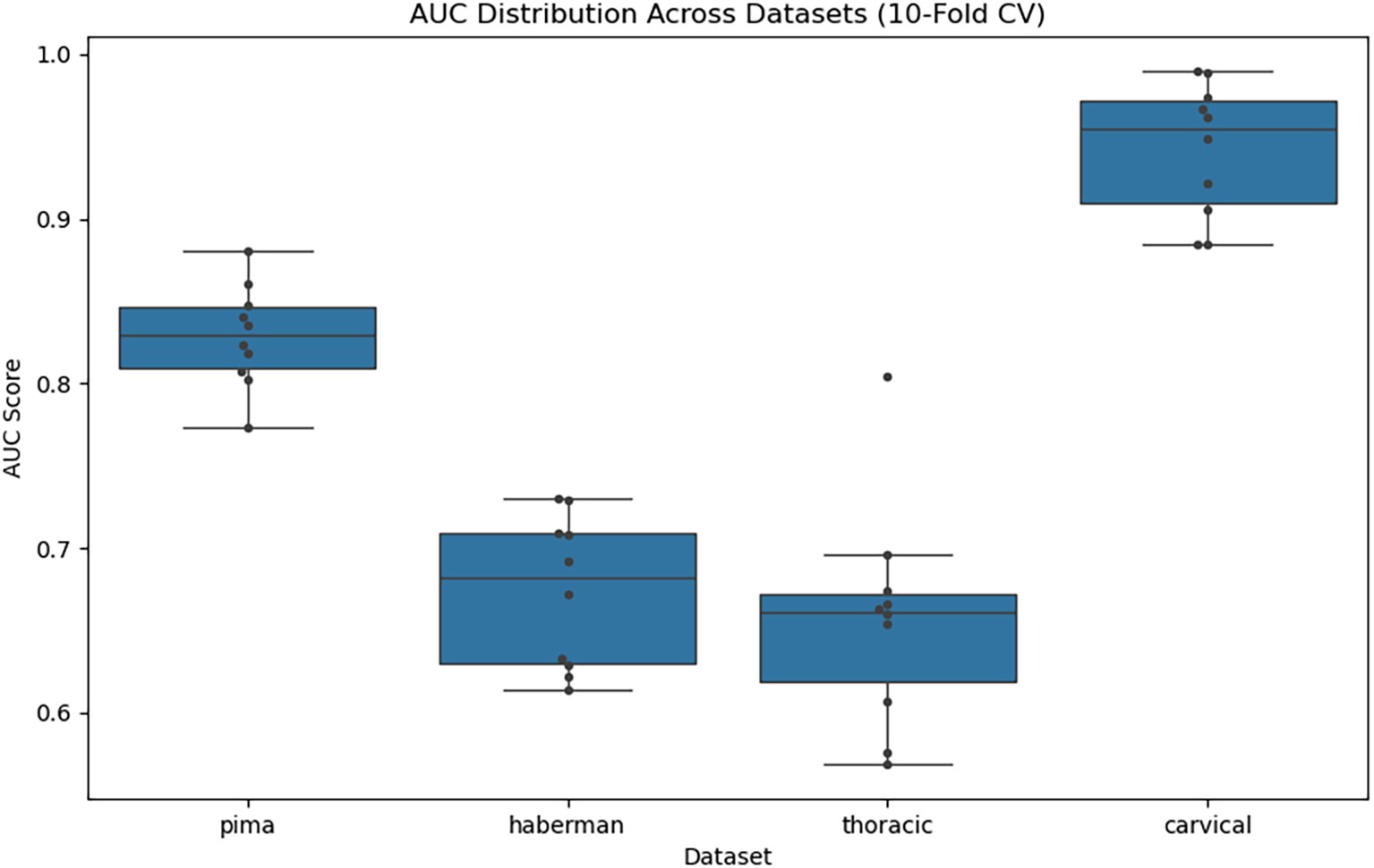 The box plot overlaid with swarm points ( Figure 6) demonstrates the diversity of the different datasets. The median and IQR of AUC on the Cervical dataset presented the highest AUC scores (~0.95 median), demonstrating excellent and stable classification performance. Even for the Pima dataset, a moderate spread was observed, indicating reasonable generalization for the model. The Haberman and Thoracic datasets, on the other hand, demonstrated lower and more variable AUCs, around a median of 0.66–0.68, suggesting struggles possibly with class imbalance or limited separability.