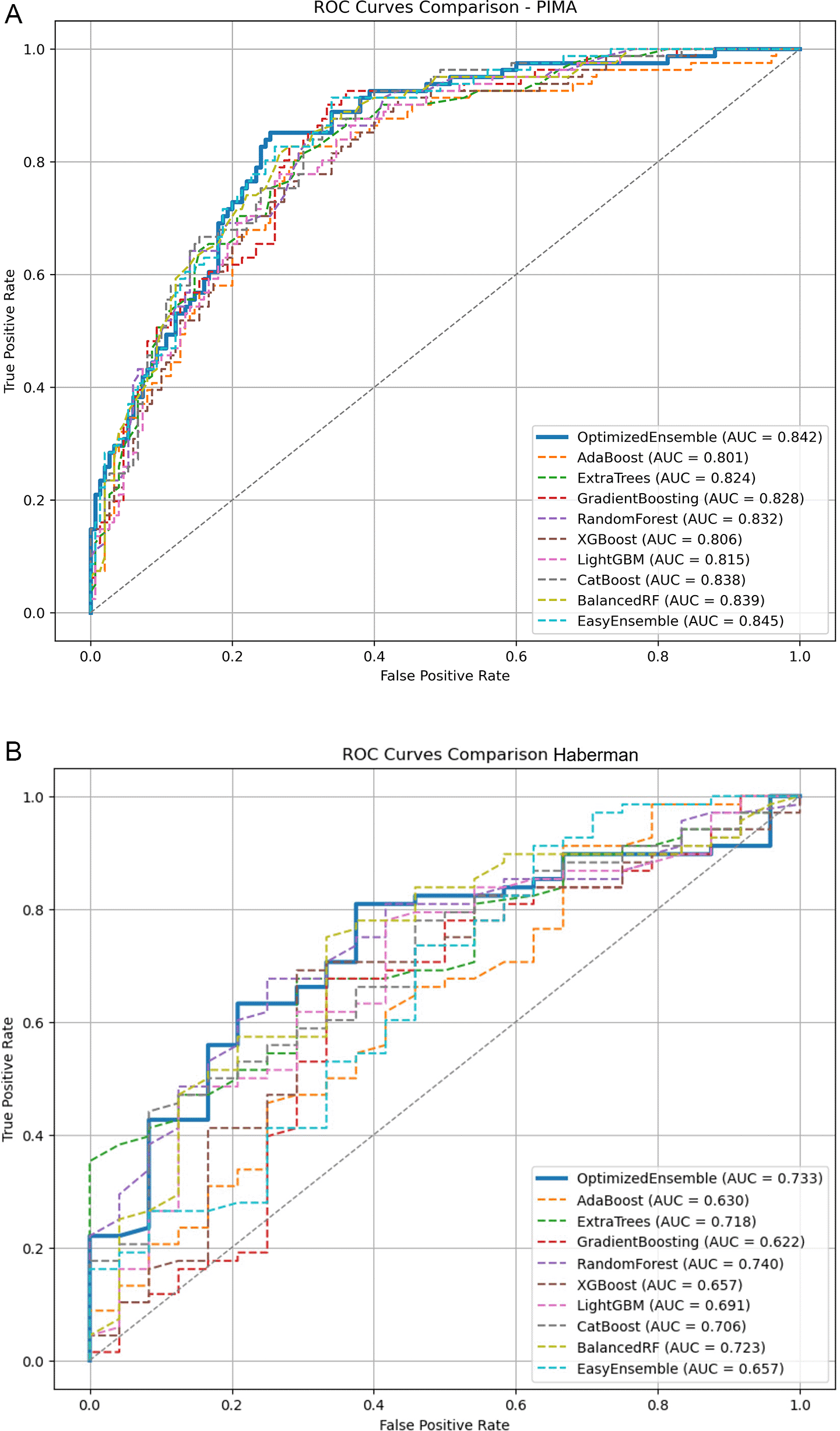 We conducted experiments on four real-world medical datasets, whose imbalance ratios vary from 1.89 to 14.6, using OEDE in the original, SMOTE, and ADASYN balanced conditions. Experimental results demonstrate substantial performance gain of OEDE on the challenging Thoracic dataset, achieving a 70.08% AUC, outperforming the standard Random Forest (50.82%) and AdaBoost (47.15%) baselines by over 19%. Additionally, on the Cervical Cancer dataset, the model achieved a peak AUC of 97.89%. The results indicate that the proposed OEDE consistently outperforms or is competitive with traditional ensemble models in terms of AUC, F1-score, and Recall. ROC curve analysis also approved the OEDE’s superior discriminative capabilities.