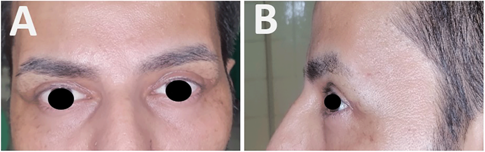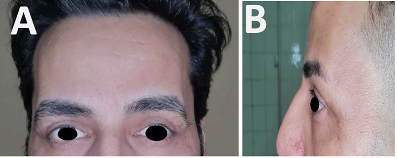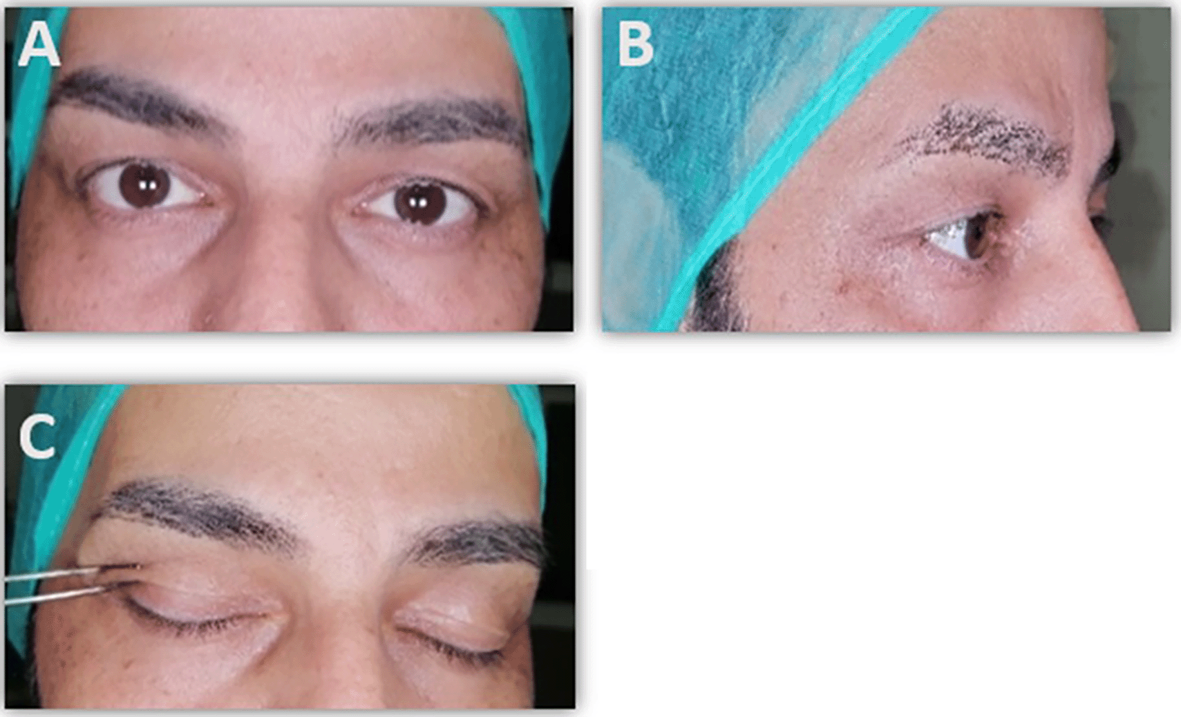 A 45-year-old Syrian man presented to the Department of Oral and Maxillofacial Surgery, Damascus University, in 2024 with complaints of bilateral upper eyelid dermatochalasis and a two-year history of repeated periocular botulinum toxin (BT) injections (two sessions every three months). While initial improvement was noted, he experienced recurrence of eyelid skin redundancy accompanied by headaches, ocular heaviness, and functional discomfort. Clinical examination revealed bilateral upper eyelid skin redundancy with mild lateral hooding and intact levator function. Superior visual field restriction was documented. Given the persistence of functional impairment and aesthetic dissatisfaction, bilateral upper eyelid blepharoplasty was planned. Intraoperatively, excessive preaponeurotic fat was identified and carefully excised along with redundant skin, while preserving the levator apparatus and orbital septum. A small segment of the orbicularis oculi muscle was also removed to enhance eyelid contour. The procedure was completed without intraoperative complications. Postoperatively, the patient reported complete resolution of eyelid heaviness and subjective improvement in the visual field (Figure 1). Aesthetic results were favorable, demonstrating improved eyelid contour and symmetry. Patient-reported satisfaction, measured using the Blepharoplasty Outcomes Evaluation (BOE) questionnaire, increased from 25% preoperatively to 96.8% at both three and six months follow-up.