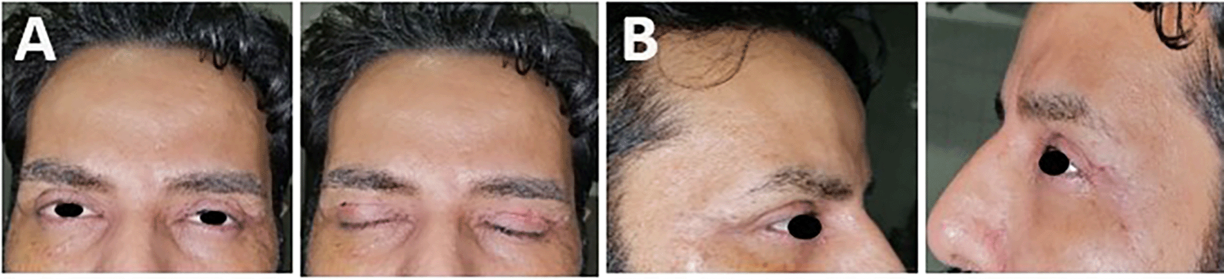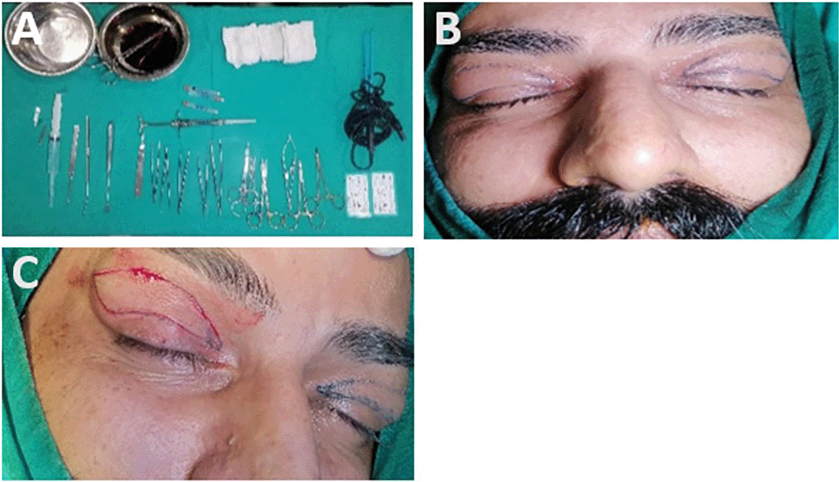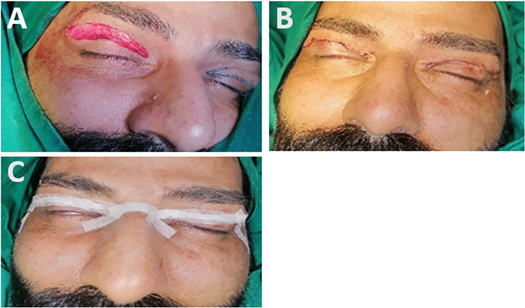 Closure: The wound edges were approximated with interrupted 6-0 polypropylene sutures placed within the natural lid crease for optimal scar concealment. The incision was reinforced with Steri-Strips to support wound healing (Figures 2–4).
