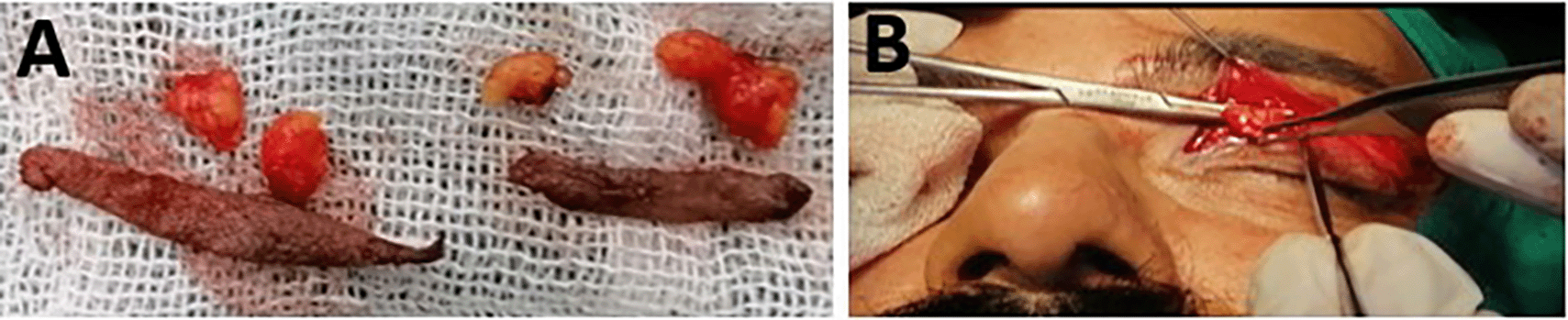 Anesthesia and incision: Local anesthesia was administered using 20 mg/mL mepivacaine with adrenaline.12 The skin incision followed the natural eyelid crease, and redundant skin was carefully excised using fine scissors. Hemostasis was meticulously maintained to minimize postoperative edema and ecchymosis.
