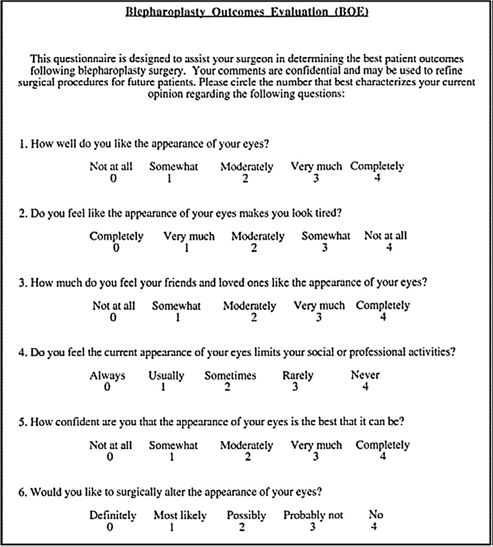 Dermatochalasis; Upper eyelid blepharoplasty; Blepharoptosis; Botulinum toxin; Blepharoplasty Outcomes Evaluation (BOE); Case report.