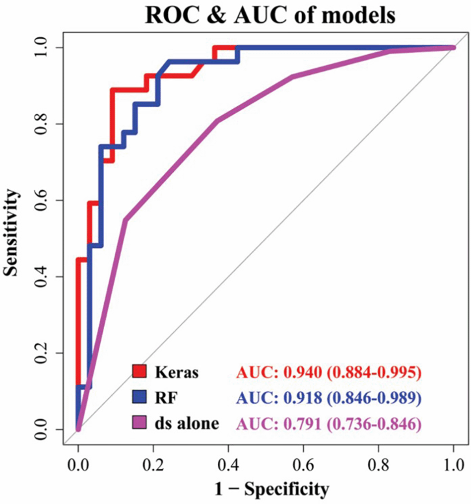Multilayer perceptron had the highest AUC (0.940), being followed by random forest (RF) (0.918) and disc shape (ds) alone (AUC 0.630). Image adapted from Kim, J. Y. et al.22