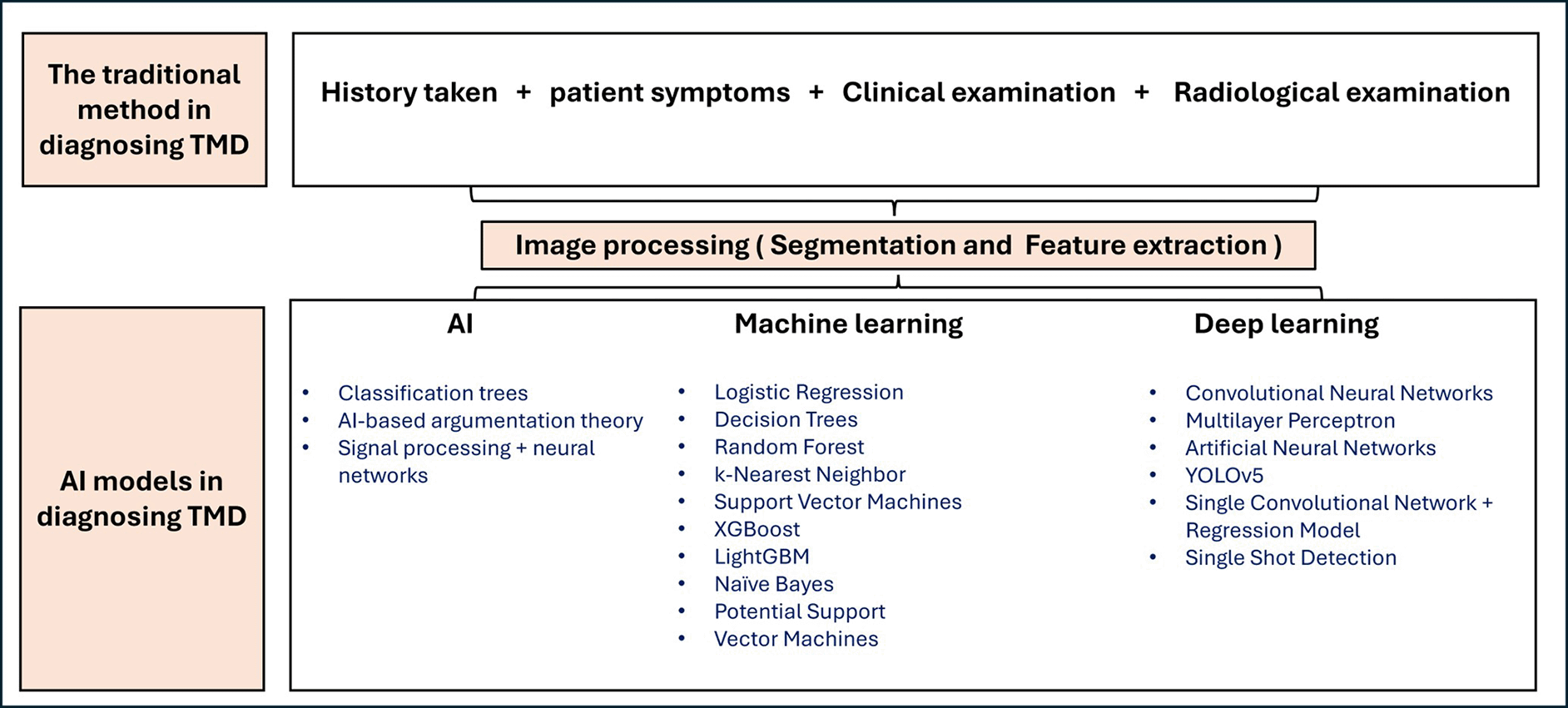This Figure 3 compares existing diagnostic models with developing AI-based techniques for diagnosing TMD.
