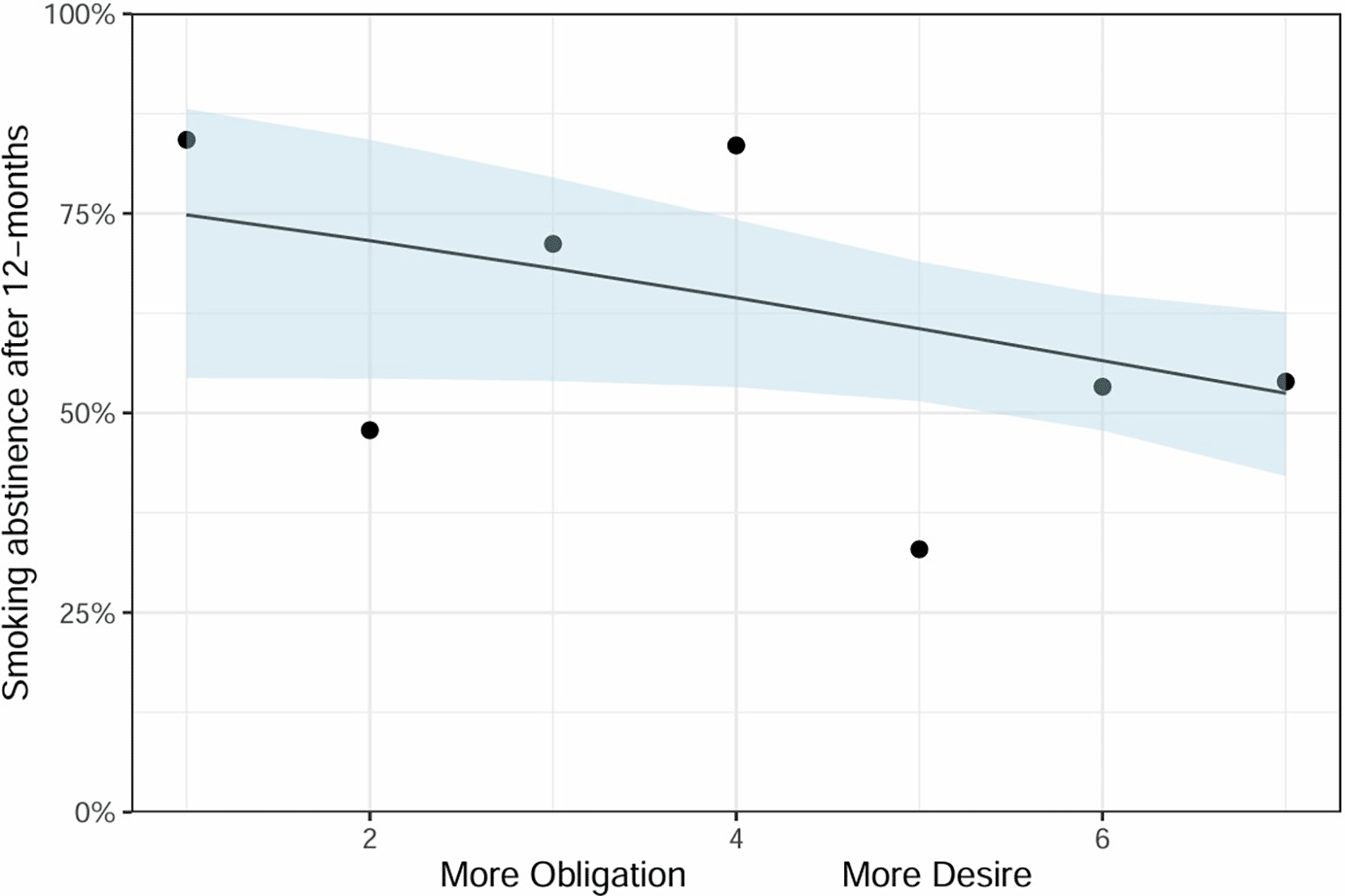 Being more motivated by desire than obligation does not appear to be positively associated with continued smoking abstinence at 12-month follow-up. This suggests obligation over desire may play more of a role in sustaining quit attempts, but more data across multiple time points are needed to understand this association.