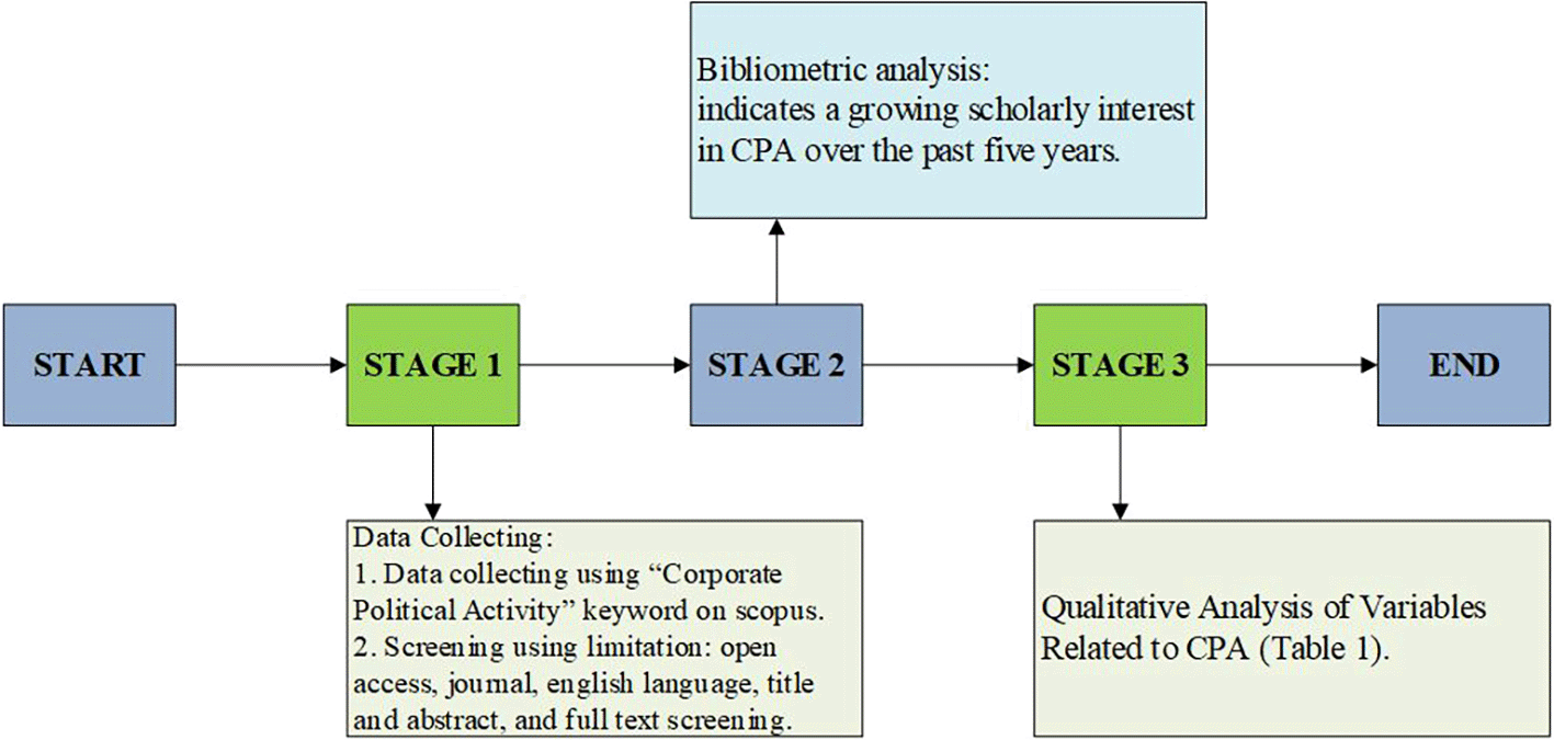 Figure 1 illustrates the research methodology framework employed in this study, which consists of three sequential stages, beginning with data collection and concluding with the qualitative synthesis of variables related to Corporate Political Activity (CPA). The process starts with Stage 1, where relevant literature was identified using the keyword “Corporate Political Activity” through the Scopus database. During this phase, specific screening criteria were applied to refine the search results, including limiting the selection to open-access journal articles, written in English, and published between 2020 and 2025. Furthermore, the articles underwent multiple layers of screening, including title and abstract review followed by full-text assessment to ensure their empirical relevance and alignment with the research objectives.