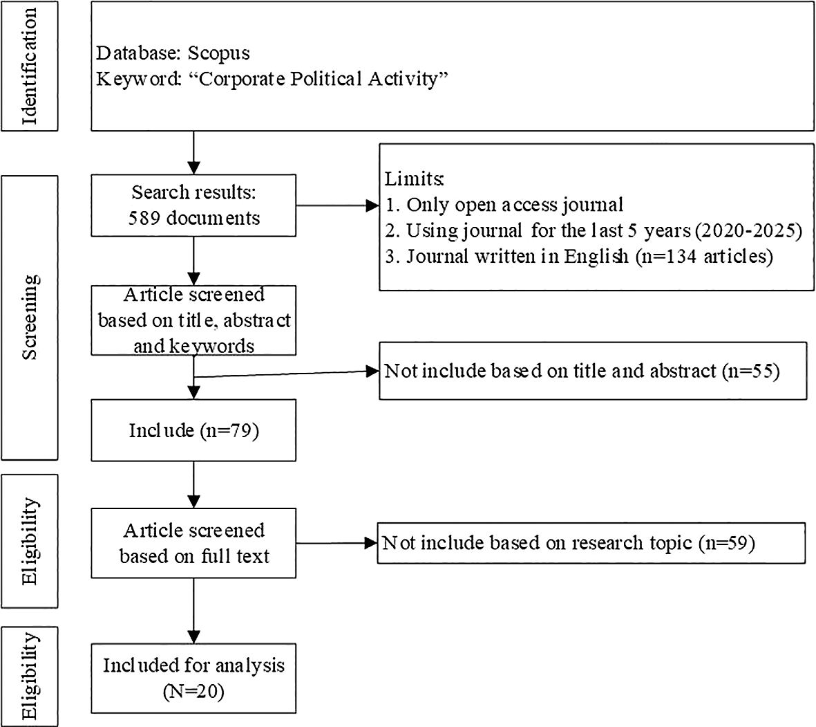 An initial search using the keyword “Corporate Political Activity” in the Scopus database yielded a total of 589 articles. No filters were applied at this stage to capture the broadest range of potentially relevant literature.