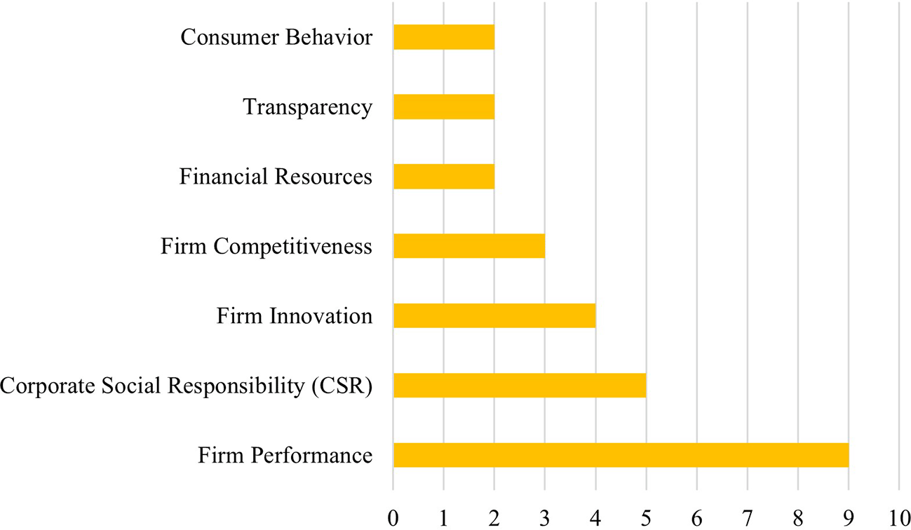 CPA was most frequently examined as an independent variable, often linked to outcomes such as firm performance, competitiveness, innovation, and corporate investment. Notably, firm performance appeared as the most common dependent variable ( Figure 4). Some studies, such as Hawk et al.30 and Leong et al.,31 examined dynamic outcomes of CPA—Hawk et al. analyzed performance persistence and volatility, whereas Leong et al. assessed corporate investment and competitive advantage, finding that CPA increases investment among medium-sized and politically vulnerable firms, while large firms benefit more from R&D than from political ties. In contrast, others, like Maia et al.,10 explored CPA’s role in sustaining or diminishing performance persistence over time, while Liedong et al.11 highlighted CPA’s darker side by documenting its positive association with firm-level bribery in weak institutional environments.