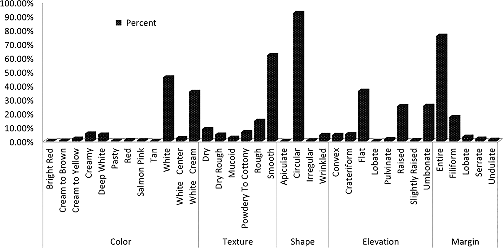 Yeast colonies grown on YPD medium were classified into distinct phenotypes based on observable morphological traits. Further analysis of wild yeast isolates from diverse sources displayed some characteristics, including creamy white pigmentation, smooth or rough colony texture, opacity, convex elevation, and entire or undulating margins (Figure 2). Predominant macroscopic characteristics included smooth (62%) or rough (14%) colony textures, circular (92.4%) or wrinkled (4.7%) shapes, smooth (75.9%) or filiform (17.5%) margins, and coloration ranging from white (46%) to cream (5.6%) or white-cream (35.7%) (Figure 1).