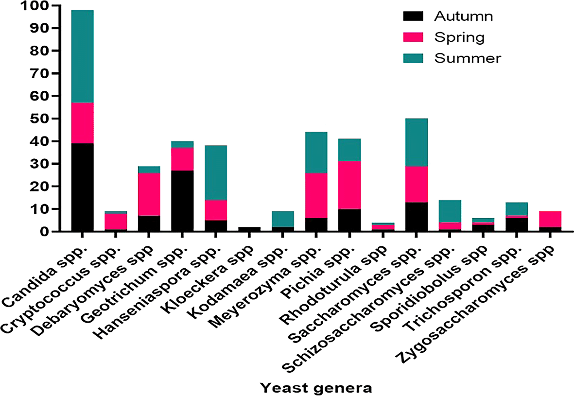 The distribution of yeast isolates varied significantly across seasons, with the highest number of isolates recorded during the summer. Specifically during the summer season, 29 yeast isolates were obtained from Ficus sycomorus, 25 from Ficus exasperata Vah, and Ritchiea albersii. Additionally, 19 isolates were recorded from Cordia africana in autumn and 23 from Ficus vasta in the spring. Accordingly, summer yielded the most common yeast species, namely Candida spp. (41 isolates), followed by Hanseniaspora spp. (24) and Saccharomyces spp. (21). In autumn, Candida spp. (39) and Geotrichum spp. (27) dominated the isolated yeast population, while in spring, Meyerozyma and Pichia spp. were the most frequently encountered yeast species (Figure 10).