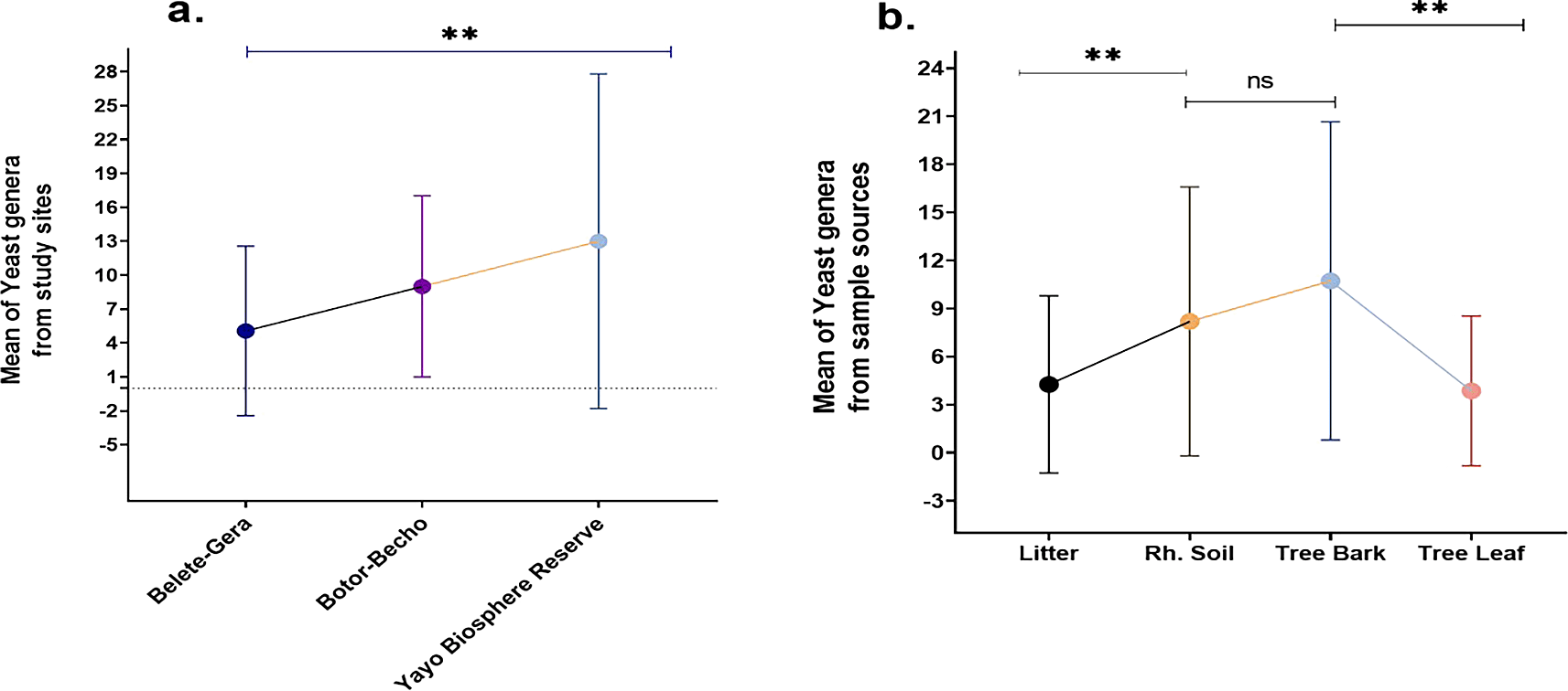 The Yayo Biosphere Reserve yielded the highest mean number of yeast genera (13), demonstrating a significant difference in yeast populations between study sites. Across the study locations, the mean abundance of yeast genera was significant (Figure 11a). There was a noticeable difference in the mean yeast genus abundance between the bark and leaf and between the rhizosphere soil and litter. But there was no significant variation between the rhizosphere soil and the bark (Figure 11b). The structure of yeast communities in litter was found to be strongly influenced by the predominant tree type, with the litter contributing secondary metabolites that act as nutritional sources for specific yeast species. These metabolites were proposed to be the primary factor influencing yeast composition, rather than the nutrient content.48