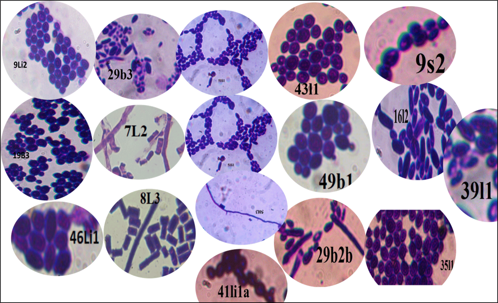 Microscopic examination revealed diversity in cell shape and size, with apiculate (17.2%), round (28.1%), and oval (20.3%) shaped cells being most common. Cell sizes varied between small (17%), medium (57.6%), and large (25.1%), and the majority of cells reproduced by budding (82.7%), while the remaining cells (17.2%) did not exhibit budding (Figure 3). Other cells exhibited ellipsoidal, ogival, spherical, or oval morphologies (Figure 4), results consistent with findings from prior studies.21