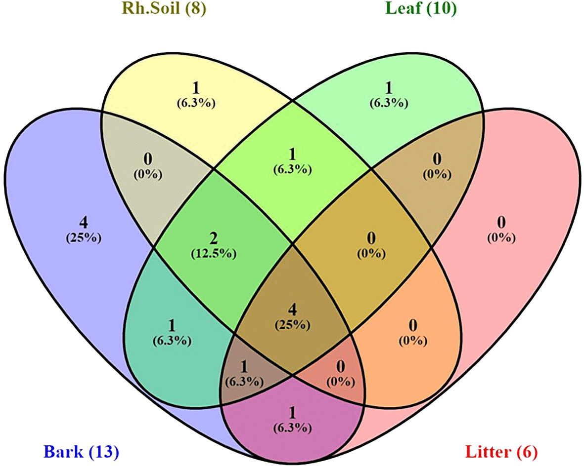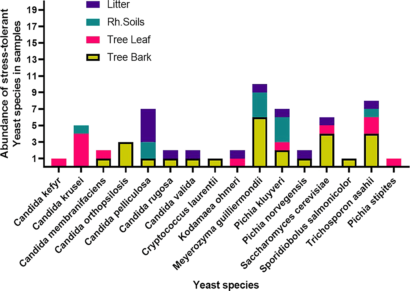 Yeast species distribution varied across substrates. For instance, 25% of the species were exclusively associated with bark, and 6.3% each with rhizosphere soil and leaves. Species commonly found across all substrates except leaves were S. cerevisiae, M. guilliermondii, Pichia norvegensis, T. asahii, and C. pelliculosa. Notably, Pichia kluyveri and C. krusei. Kodamaea ohmeri was specific to leaves and leaf litter, while bark, leaf, and litter shared P. norvegensis and C. valida (Figure 9).