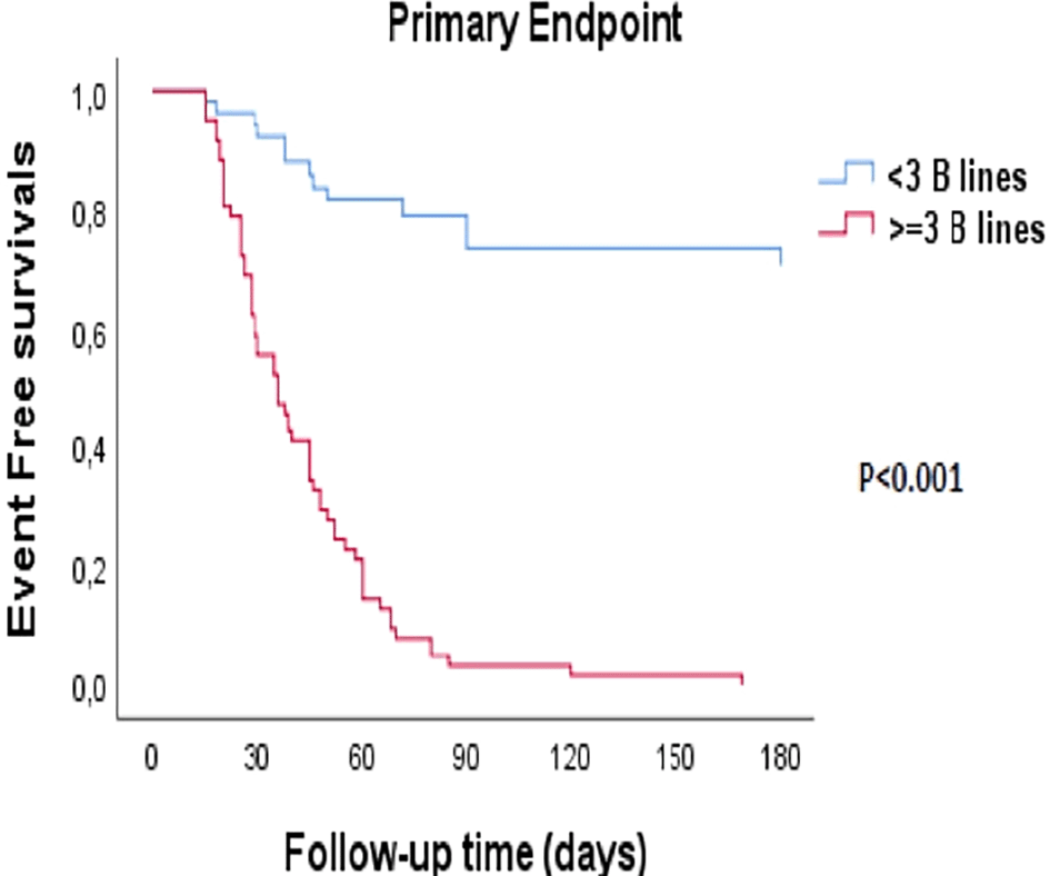 • Event-free survival analysis showed that patients categorized with <3 B-lines exhibited a 76.4% event-free survival rate at six months (adjusted p < 0.001), whereas those with ≥3 B-lines had notably poorer outcomes.