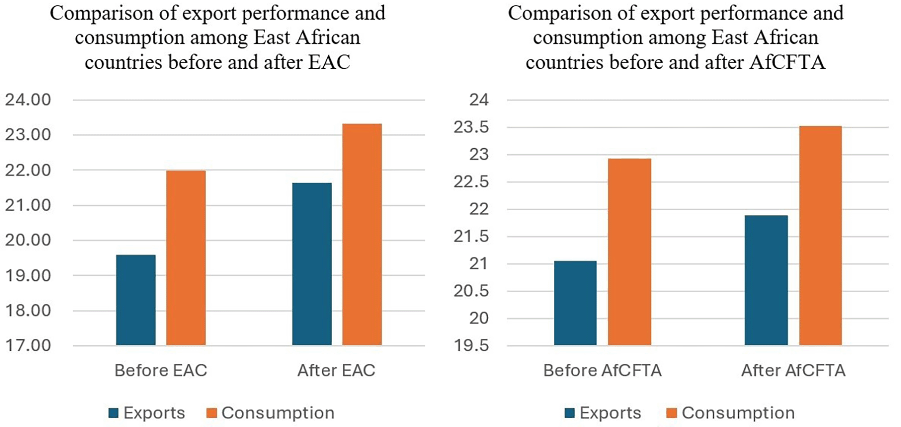 • Figure 1 presents a comparative analysis of the exports and household consumption of selected East African countries, examining the periods before and after their accession to the East African Community (EAC).