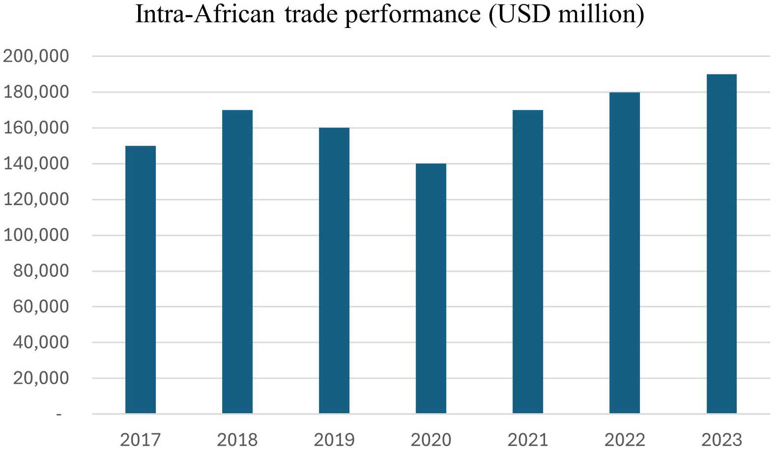 The African Continental Free Trade Area (AfCFTA) represents a significant stride towards enhancing intra-regional trade within Africa. This strategic initiative offers a promising avenue for the continent to mitigate the adverse effects of external shocks and bolster its economic resilience (African Trade and Economic Outlook, 2024). Figure 2 describes the intra-African trade performance from 2017 to 2023. Concurrently, Figure 3 presents a comparative analysis of exports, imports, and household consumption across selected EAC countries for the year 2020.