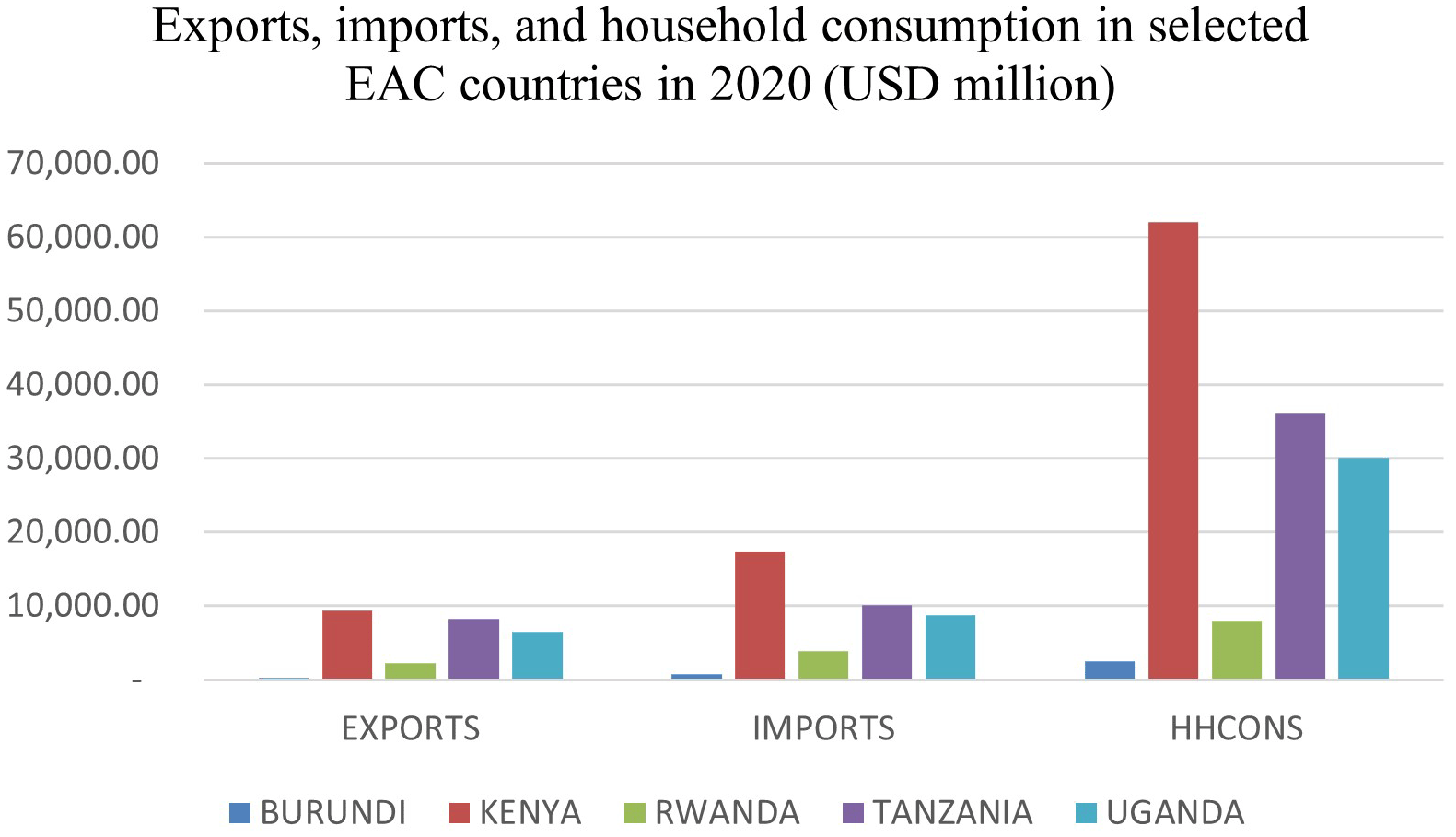 Figure 3. Exports, imports, and household consumption in selected EAC countries in 2020 (USD million).