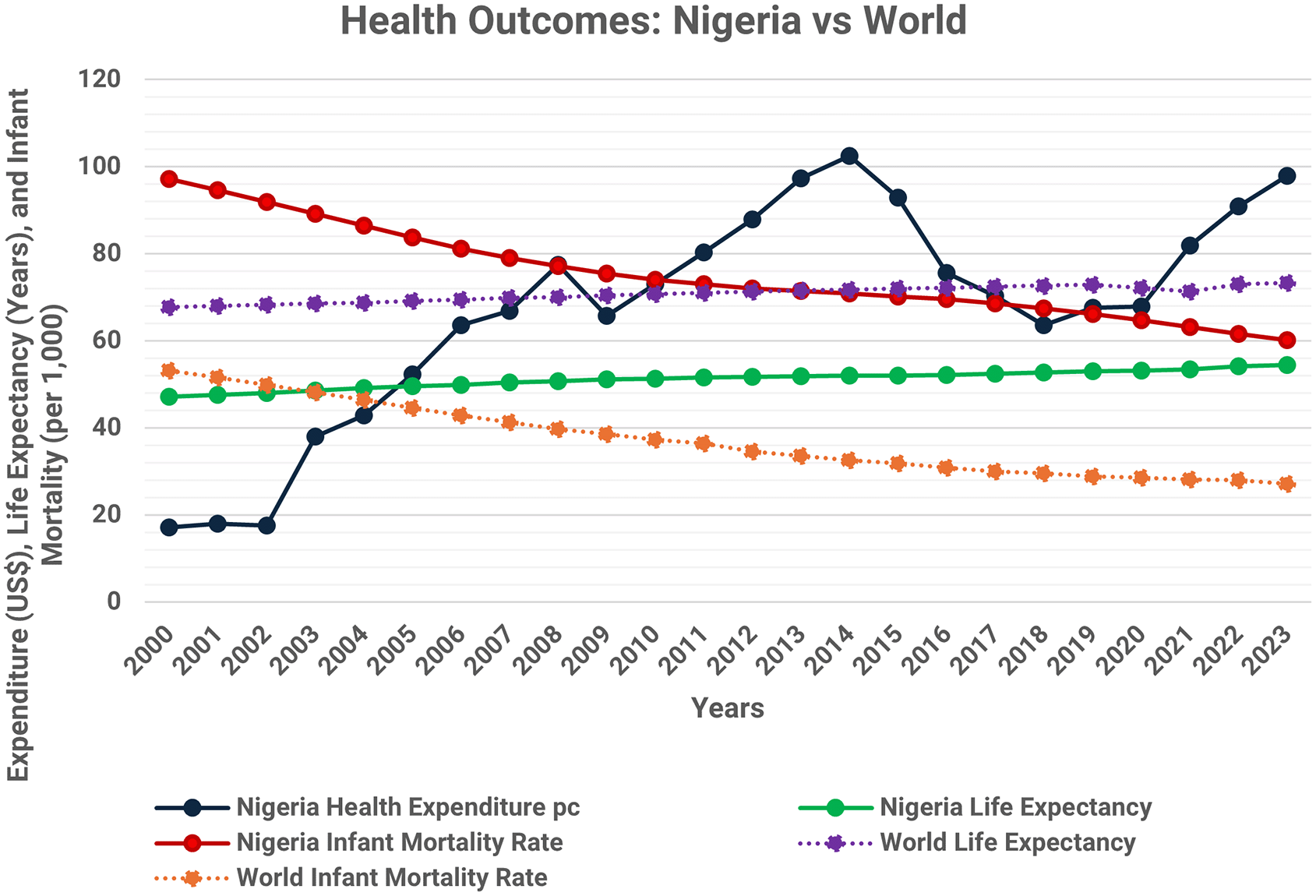 Figure 1, using World Development Indicator’s data, depicts that Nigeria’s health expenditure per capita (pc) is rising over time, life expectancy gradually improving, and infant mortality rates steadily declining; however, the outcomes pales in comparison to global trends. Adegoke et al.7 explain that despite intensified expenditure since the Millenium Development Goals (MDGs), Nigeria remains not on target for Sustainable Development Goal (SDG) 3: “good health and well-being.” Nnamdi and Ngwu8 provide further depth: while private expenditure raises outcomes, public expenditure generates less potent impacts, while OPHS is a negative force, reducing life expectancy as it raises death rates. Thus, health finance is not a question of quantum-of-resources but their composition, their efficiency, and their management. As Pitkänen et al.20 emphasized, incorporating principles of sustainability in welfare and health finance is essential for social sustainability because effective and justified schemes provide a foundation for sustained welfare in society.