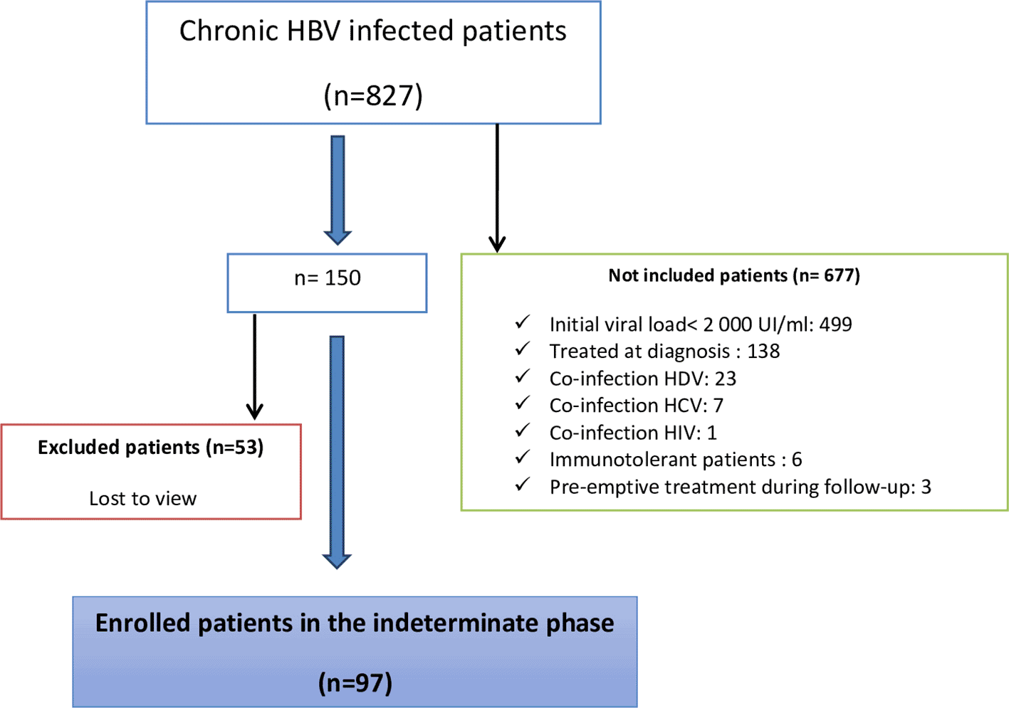 A total of 827 patients were followed up for chronic HBV infection. There were 53 patients who were excluded because they were lost to follow-up. The flow diagram of the study population is shown in Figure 1. Moreover, 677 patients were not included in the study; among them, 499 had an initial viral load of < 2000 UI/ml. Finally, 97 patients who fulfilled the inclusion criteria were included (Figure 1).