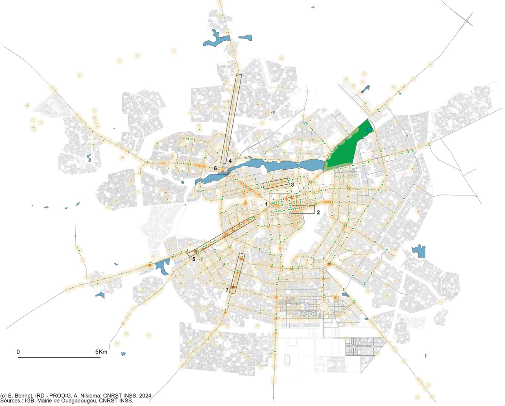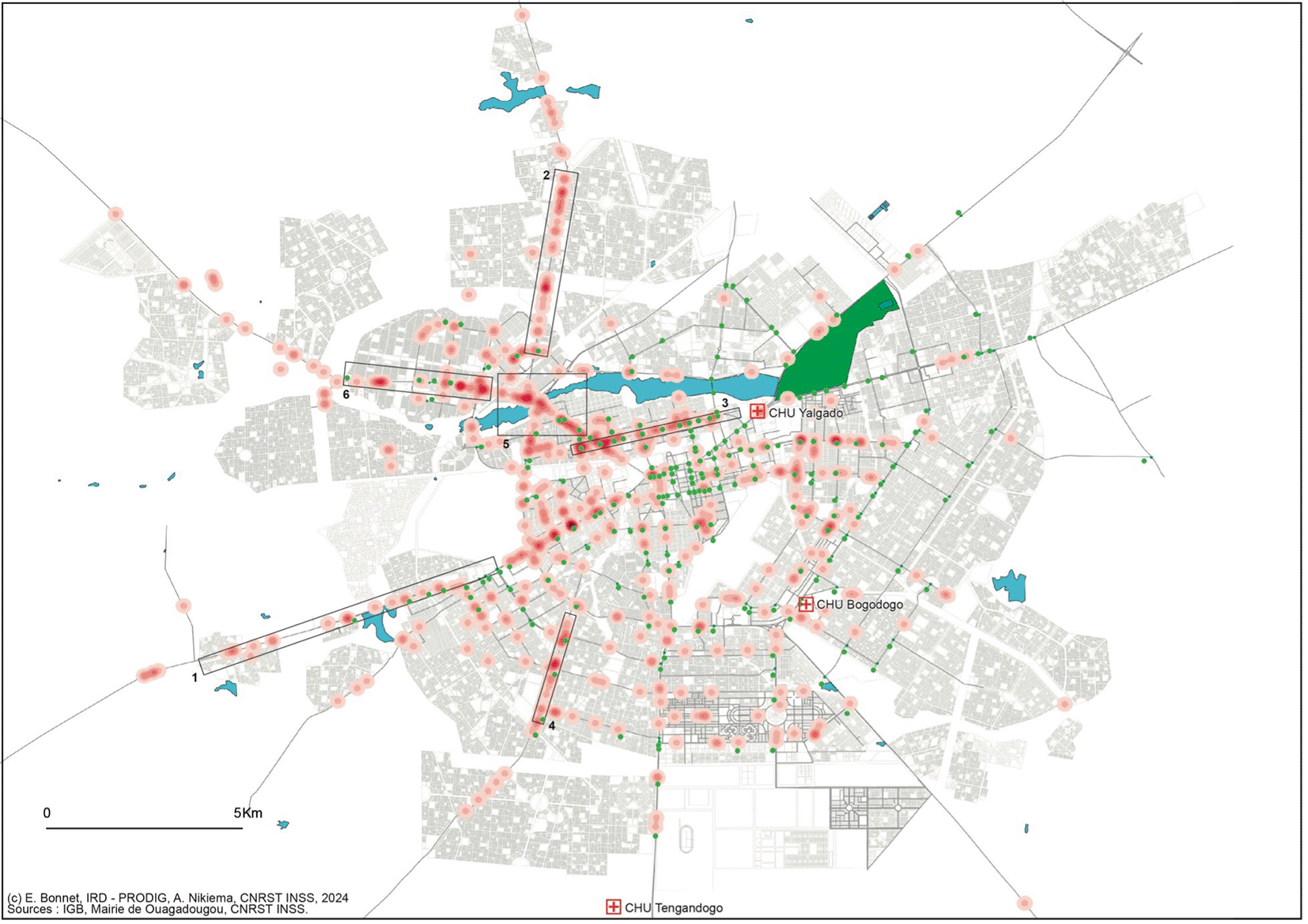 All major roads to the city centre have significant crashes densities ( Figure 1), especially near traffic lights (green point) and major intersections. The city centre, around the United Nations roundabout and the roads serving the central market, the presidency (1) and the shopping district of Koulouba (2), have the highest densities. The Rue de la Liberté (3) and the urban roads joining the national roads leading to Kamboinsin (4) and Bobo-Dioulasso (5) are notable road traffic crash-prone routes. Interchanges were built on these roads at key traffic hubs in order to relieve traffic congestion and reduce its corollary, crashes, which were particularly visible at the northern interchange (6). They have helped to reduce the phenomenon. To the south of the city, the Avenue de la Dignité (7) tarmacked for less than a decade, has high densities of minor crashes. Although most reported crashes take place along paved roads, interventions are also observed in neighborhoods, but concentrations remain low. This also applies to slum areas but more rarely in the light of the findings from the formal housing areas.