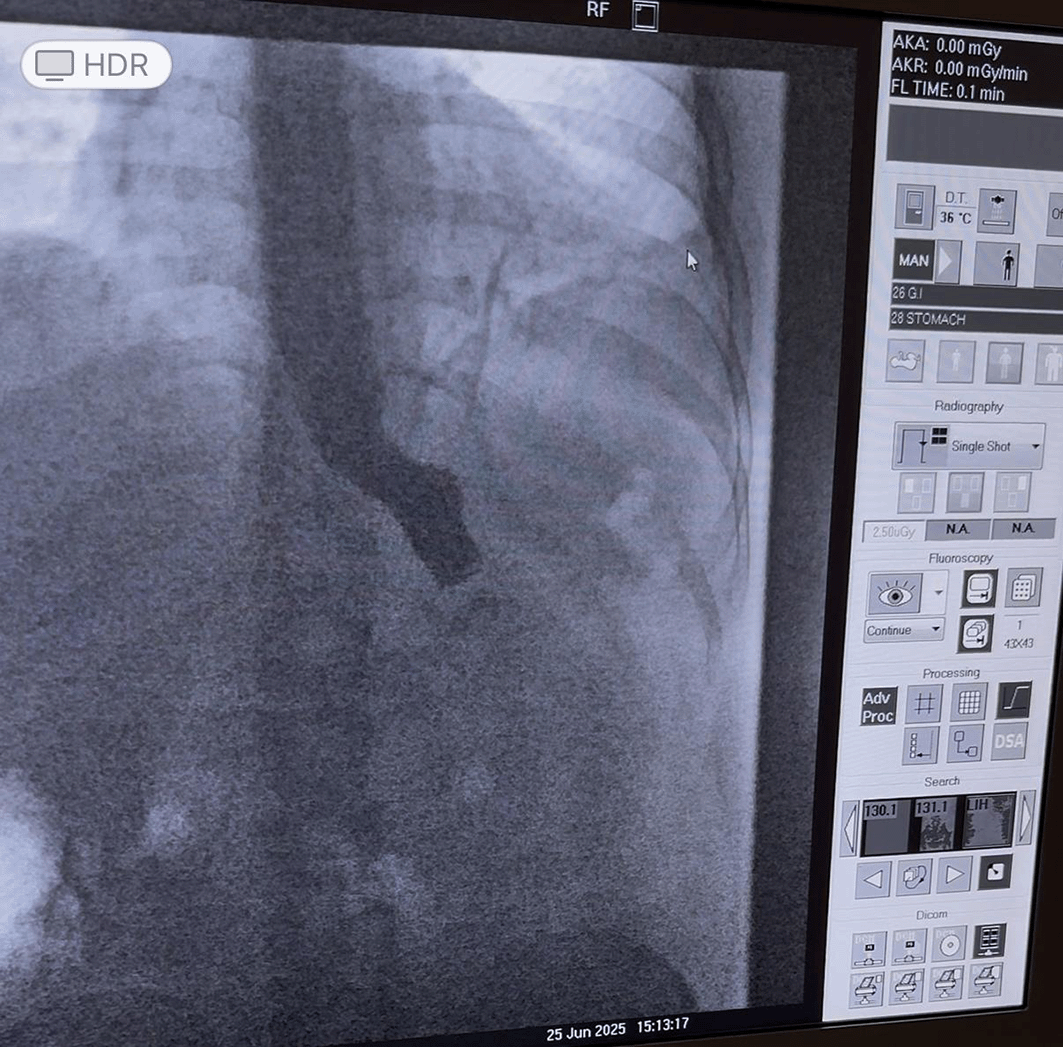 At 5:36 am the following day, the patient reported no complaints. After the morning round at 07:30, oral intake was resumed. On June 27, 2025, follow-up video gastroduodenoscopy showed a patent anastomosis. The patient was discharged the same day at 2 pm with recommendations. On September 19, 2025, follow-up revealed no complaints, no heartburn, no dysphagia, and a weight of 101 kg (-20 kg).