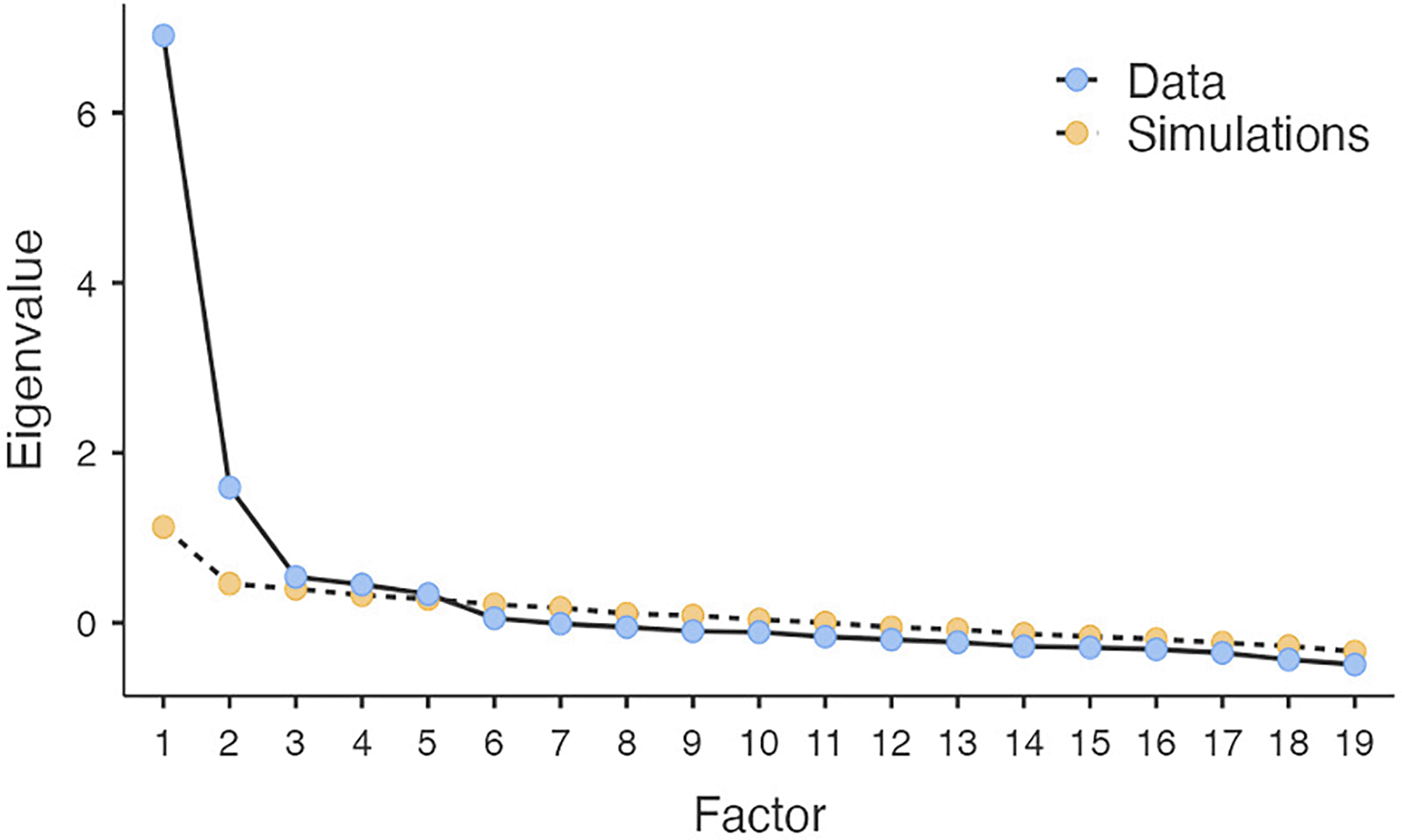 Before conducting EFA analysis, we ran the KMO of Measurement of Sampling Adequacy (MSA) and Bartlett’s sphericity test to make sure that these data are appropriate for factor analysis. The results showed that the data were appropriate for factor analysis (Kaiser, 1974) with MSA KMO = .911, and Bartlett’s sphericity test was chi-square = 2534, df = 171, and p = < .001. The fit indices showed that Tucker-Lewis Index (TLI = .976) and Root Mean Square Error of Approximation (RMSEA = .034), indicating a good fit (Hu & Bentler, 1999). Model test (χ2 = 114, df = 86, p = .025).
