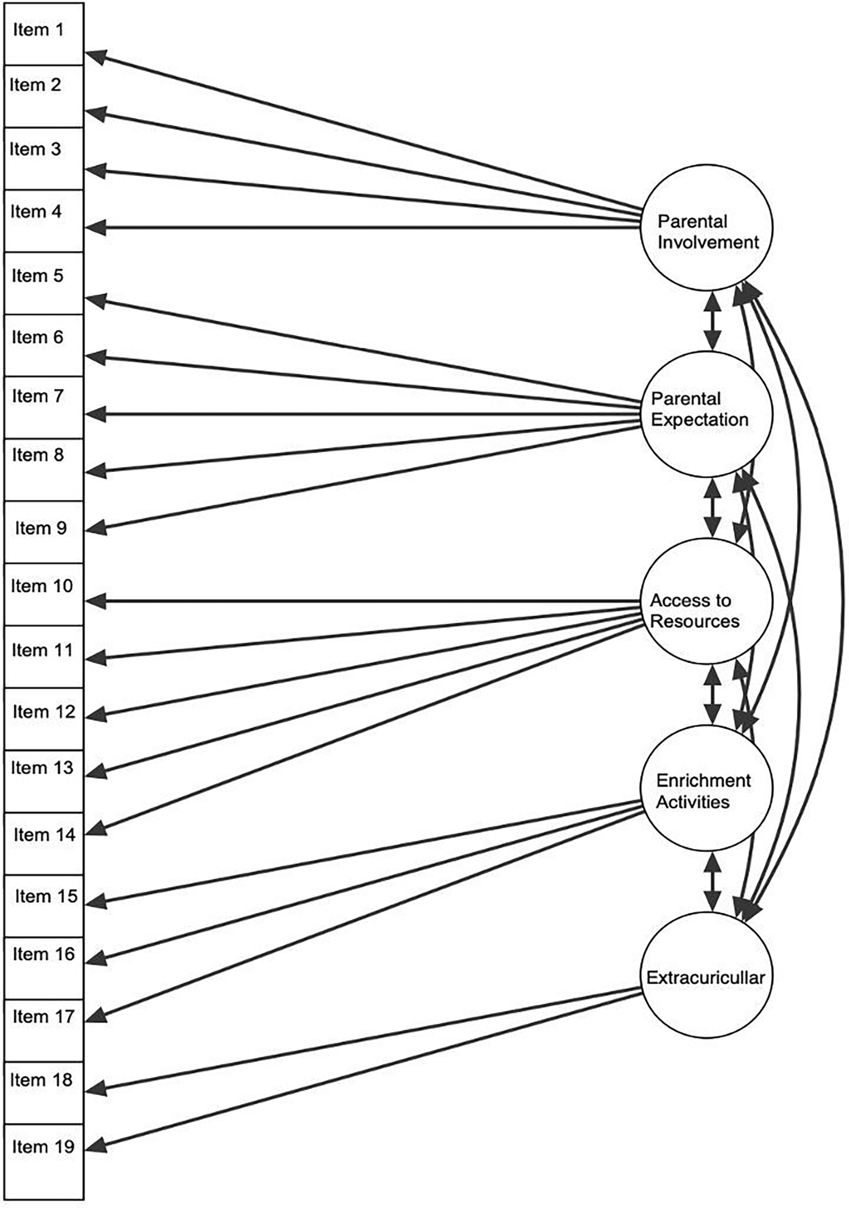 Table 4 presents the EFA results, applying the Maximum Likelihood extraction method accompanied by a varimax rotation. The factor loadings span from .496 to .881. Each item’s loadings are classified into five distinct factors: parental involvement, parental expectation, access to resources, enrichment activities, and extracurricular activities. Notably, the strongest indicator of the extracurricular activities construct is the factor loading associated with encouraging children to engage in activities outside of school (item 18, factor loading = .881) (Hair et al., 2019). Conversely, Item 2 exhibited the weakest loading, signifying a minimal contribution to the parental involvement factor.
