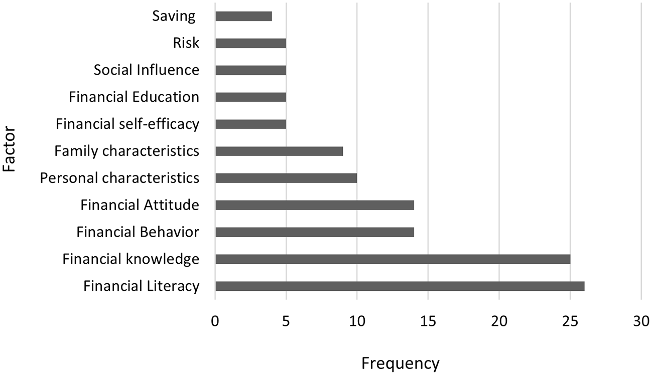 A careful selection was made of the most recurrent factors evaluated in the assessment of financial literacy among university students. As shown in Figure 2, the most frequently assessed factor—identified in 26 publications—is financial literacy itself. This concept is commonly defined as the ability to understand and manage personal finances, including budgeting, saving, using credit responsibly, planning for the future, and making informed financial decisions (Khalisharani et al., 2022). In this context, financial literacy involves the understanding, monitoring, and effective use of financial resources with the goal of promoting the well-being and ensuring the economic stability of individuals (Ajayi T. A. et al., 2022).