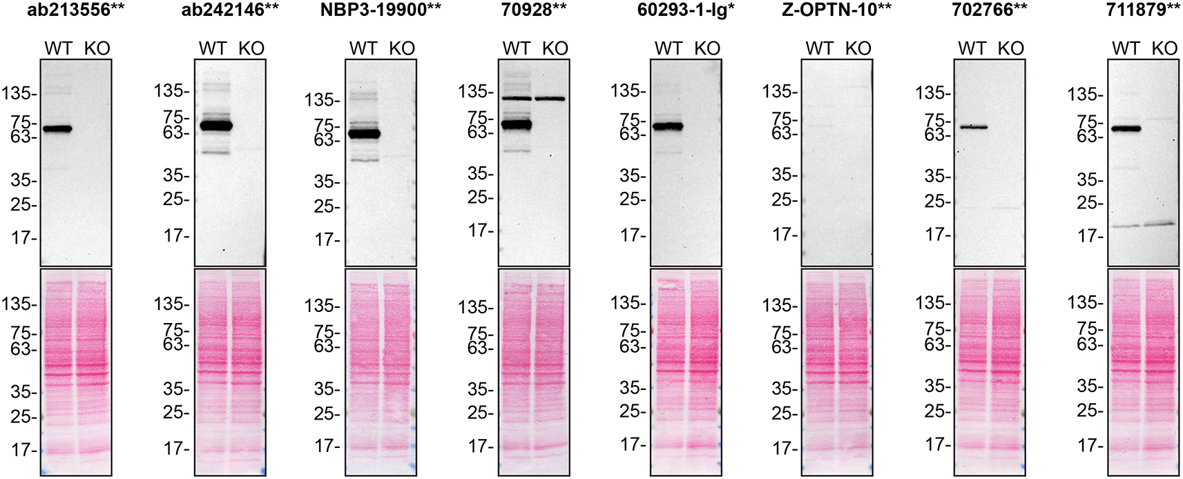 Lysates of U2OS WT and OPTN KO were prepared, and 35 μg of protein were processed for western blot with the indicated optineurin antibodies. The Ponceau stained transfers of each blot are presented to show equal loading of WT and KO lysates and protein transfer efficiency from the 4-20% Tris-Glycine polyacrylamide gels to the nitrocellulose membrane. Antibody dilutions were chosen according to the recommendations of the antibody supplier. Antibody dilutions used: ab213556** at 1/5000, ab242146** at 1/1000, NBP3-19900** at 1/1000, 70928** at 1/1000, 60293-1-Ig* at 1/5000, Z-OPTN-10** at 1/1000, 702766** at 1/200, 711879** at 1/5000, were titrated as the signal was too weak or too strong when following the supplier’s recommendations. Predicted band size: 66 kDa. ** = recombinant antibody, * = monoclonal antibody.