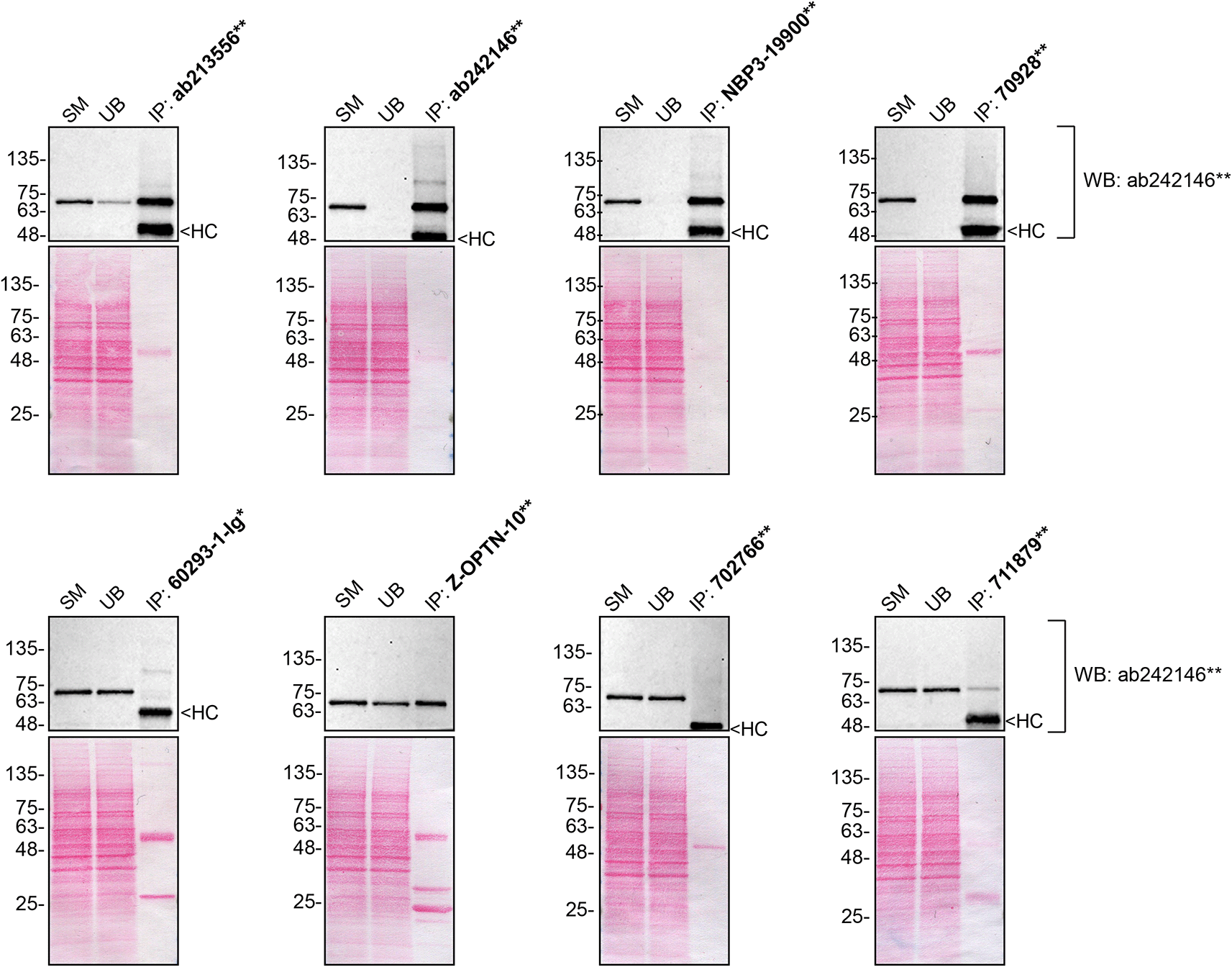 U2OS lysates were prepared, and immunoprecipitation was performed using 1 mg of lysate and 2.0 μg of the indicated optineurin antibodies pre-coupled to Dynabeads protein A or protein G or Flag-M2 magnetic beads. Samples were washed and processed for western blot with the optineurin antibody ab242146** used at 1/1000. The Ponceau stained transfers of each blot are shown. SM = 4% starting material; UB = 4% unbound fraction; IP = immunoprecipitate, HC = antibody heavy chain, LC = antibody light chain. ** = recombinant antibody, * = monoclonal antibody.