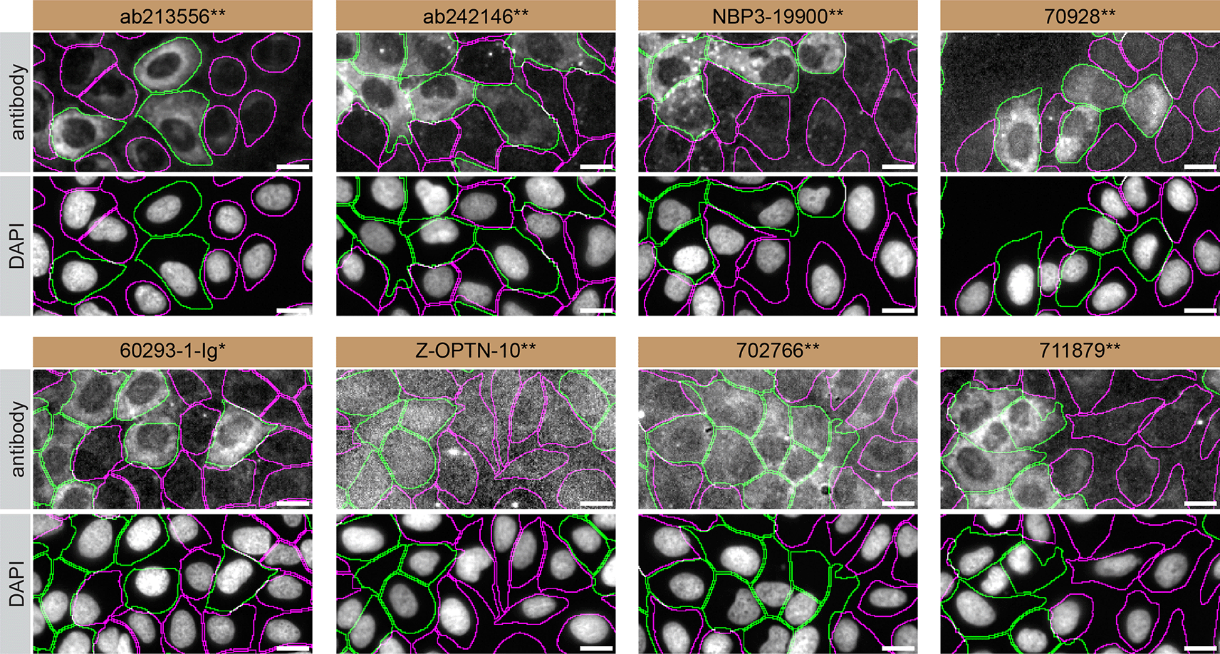 For immunofluorescence, eight antibodies were screened using a mosaic strategy. First, U2OS WT and OPTN KO cells were labelled with different fluorescent dyes in order to distinguish the two cell lines, and the optineurin antibodies were evaluated. Both WT and KO lines imaged in the same field of view to reduce staining, imaging and image analysis bias ( Figure 3). Quantification of immunofluorescence intensity in hundreds of WT and KO cells was performed for each antibody tested, and the images presented in Figure 3 are representative of this analysis.7