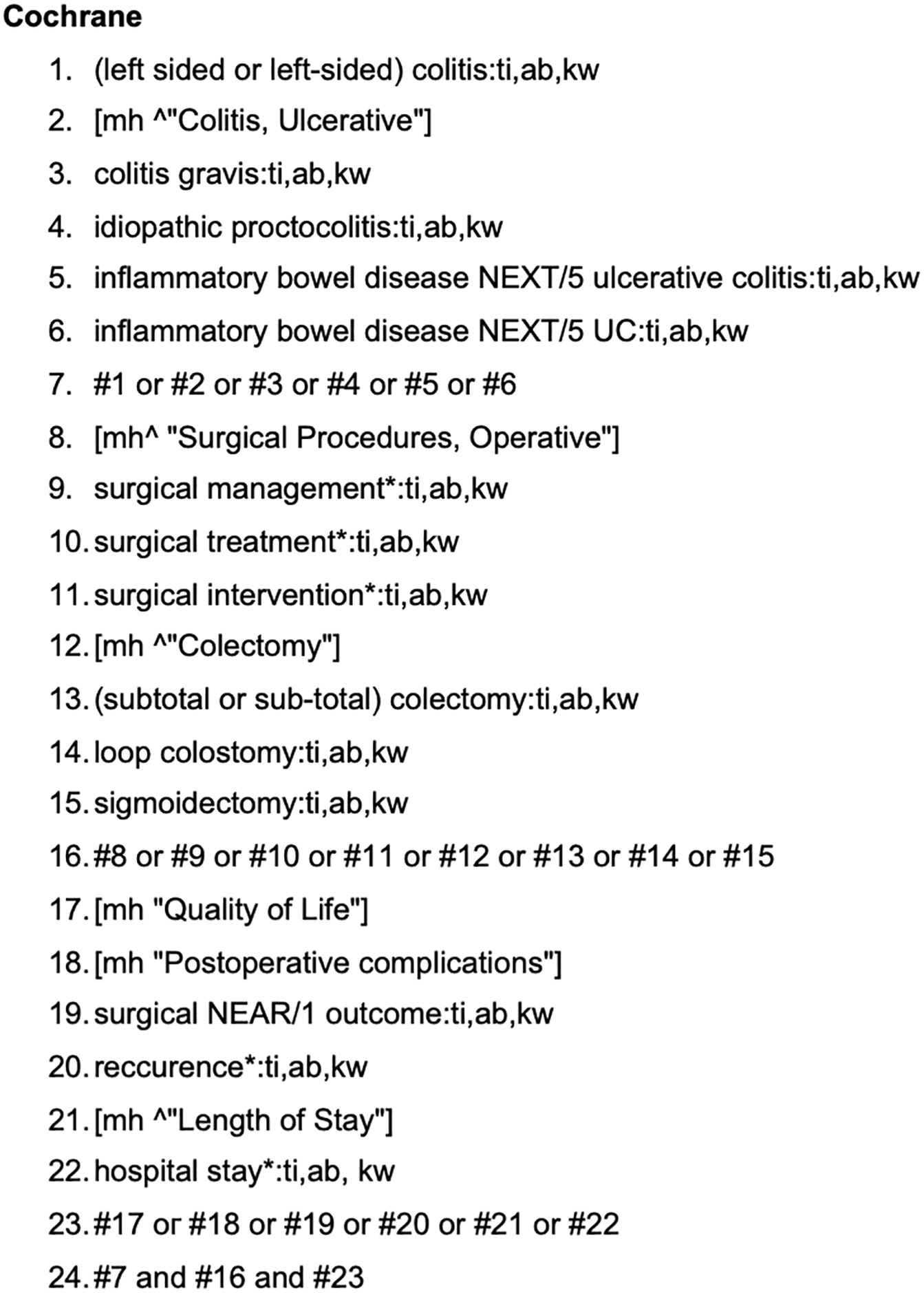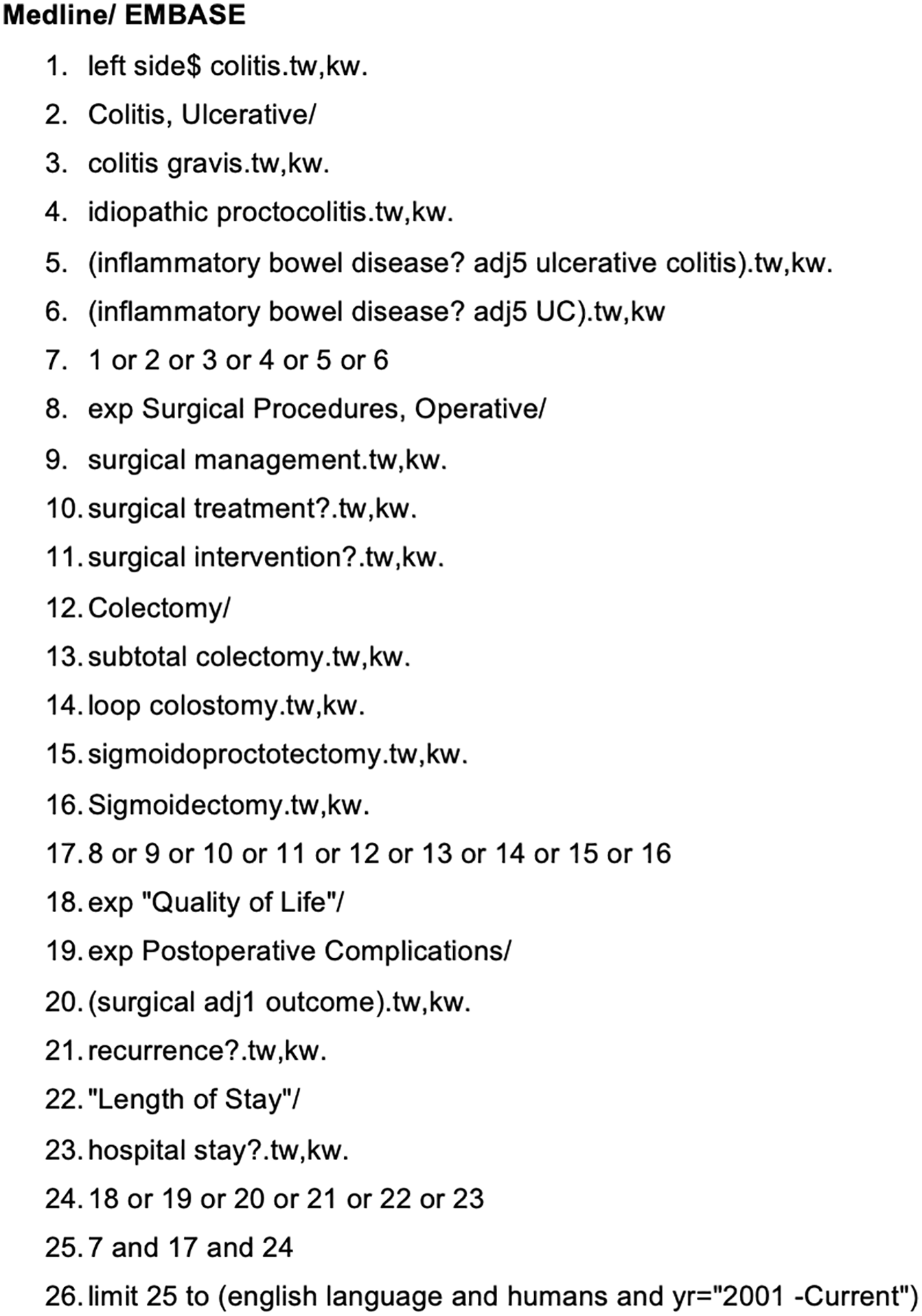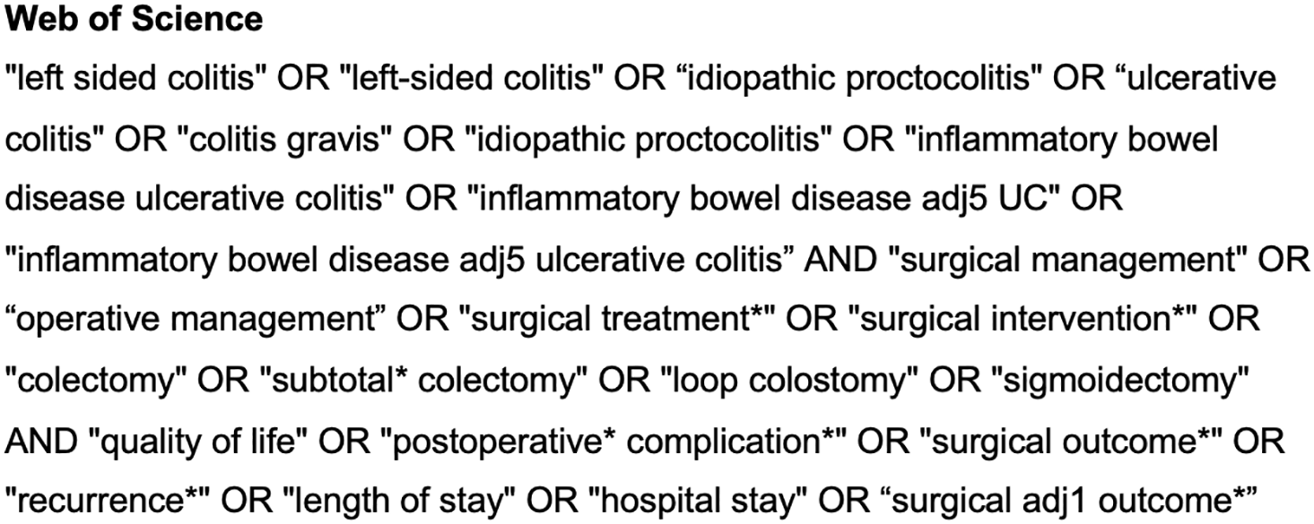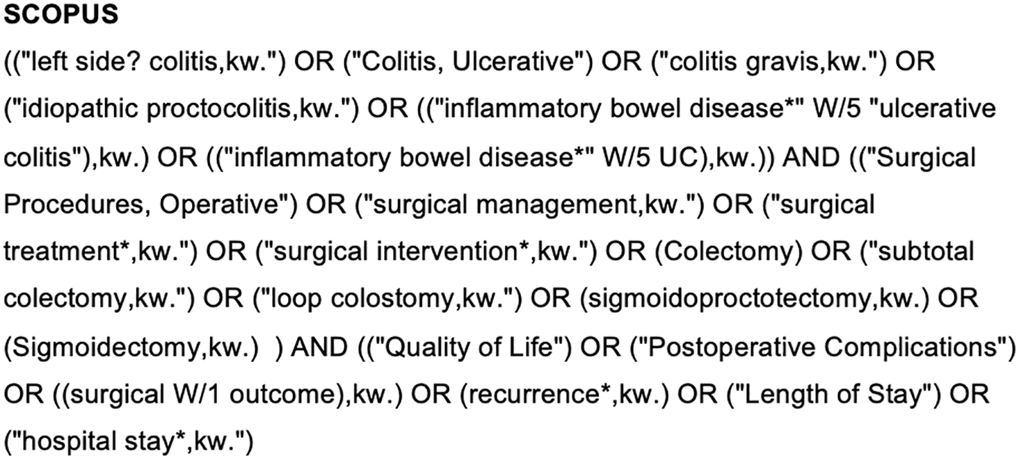 Key search terms covered disease characteristics (‘ulcerative colitis’, ‘left-sided colitis’, ‘colitis gravis’, ‘idiopathic proctocolitis’, ‘inflammatory bowel disease’), treatment methods (‘surgical management’, ‘surgical treatment’, ‘surgical intervention’, ‘colectomy’, ‘subtotal colectomy’, ‘loop colostomy’, ‘sigmoidectomy’), and patient outcomes (‘quality of life’, ‘postoperative complications’, ‘surgical outcome’, ‘recurrence’, ‘length of stay’, ‘hospital stay’). The search strategy was tailored to each database to optimise retrieval. Full search strategies are provided in Figures 1–4.