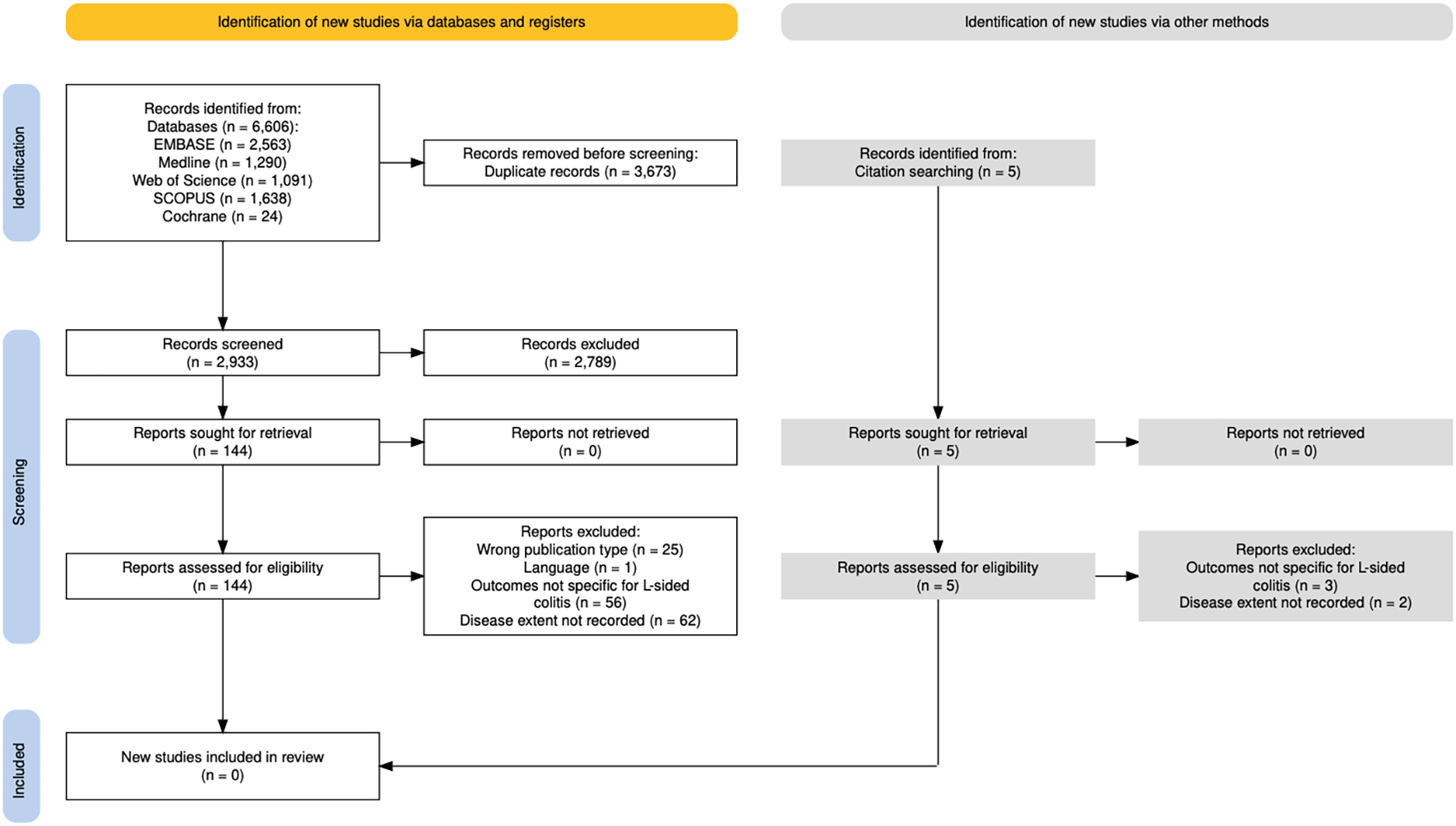 This study has several strengths. It was undertaken in a comprehensive manner utilising standard systematic review approaches. That there are no studies which met the inclusion criteria underscores the gaps in the current literature, rather than reflecting limitations in our methodology. This review highlights a clinically significant problem in a large cohort of UC patients. Our weaknesses are in the lack of published literature available for analysis. Given the lack of specific, robust data, it may be beneficial to develop a registry or multicentred collaboration to systematically assess how surgeons assess and manage acute left-sided colitis across the colorectal community.