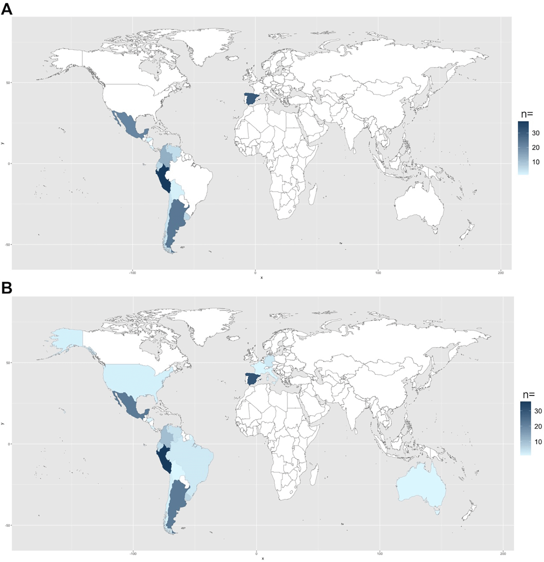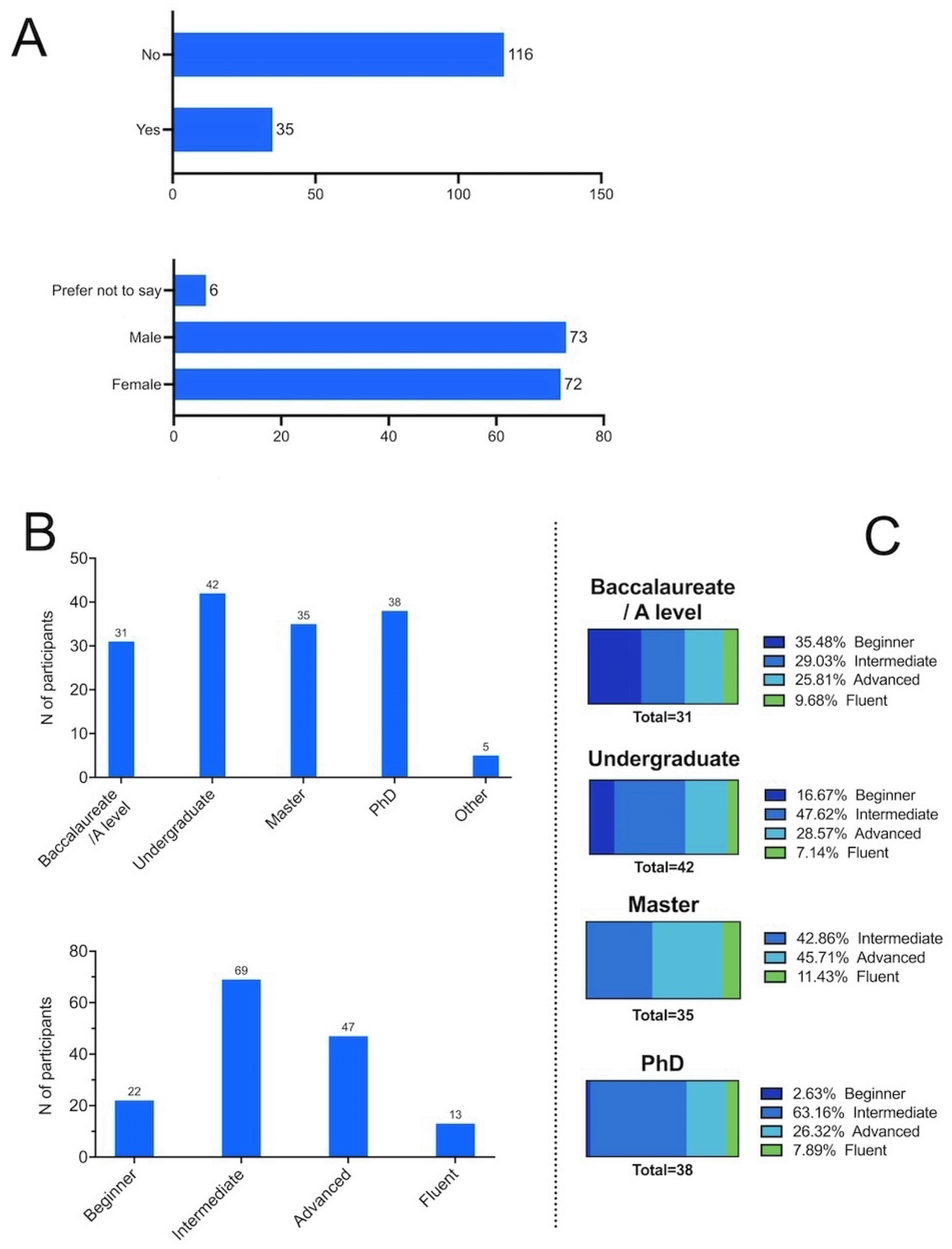 Figure 1 illustrates the distribution of participants based on their countries of origin (Figure 1A) and work (Figure 1B). Peru was the primary destination for work, attracting nearly 25% of participants, while also serving as the country of origin for 26% of the participants. Furthermore, a significant majority, approximately 75% of the participants, were engaged in work activities within the geographic regions of South, North, or Central America. Similarly, approximately 80% of the participants originate from these same regions. Almost 20% of the participants declared hailing from and working in Spain. 77% (n = 116) of participants had never worked, studied, or lived in an English-speaking country (Figure 2A). Sex representation was even across participants, with 73 self-identifying as male and 72 self-identifying as female (Figure 2A). Six participants preferred not to self-identify as either male or female.