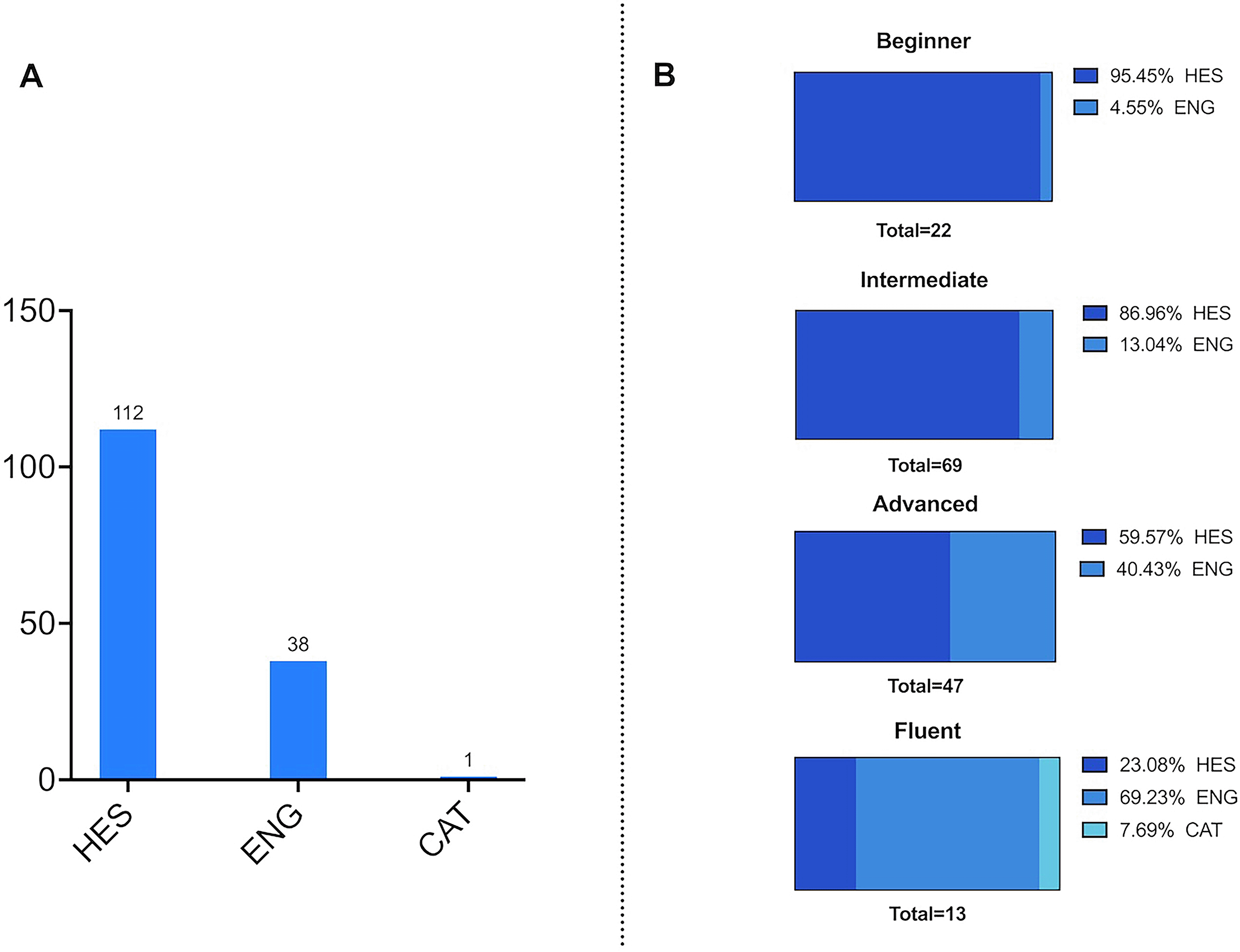 We further examined participants’ language preferences in relation to their English proficiency. The higher the English proficiency, the less inclined participants are to opt for HES as their preferred language (Figure 3B). This trend relating English proficiency and preferred language group was statistically significant ( Table 1) (X2 = 41.53, df = 6, p = <.001). The “CAT” preference was under-represented across beginner, intermediate, and advanced fluency levels.