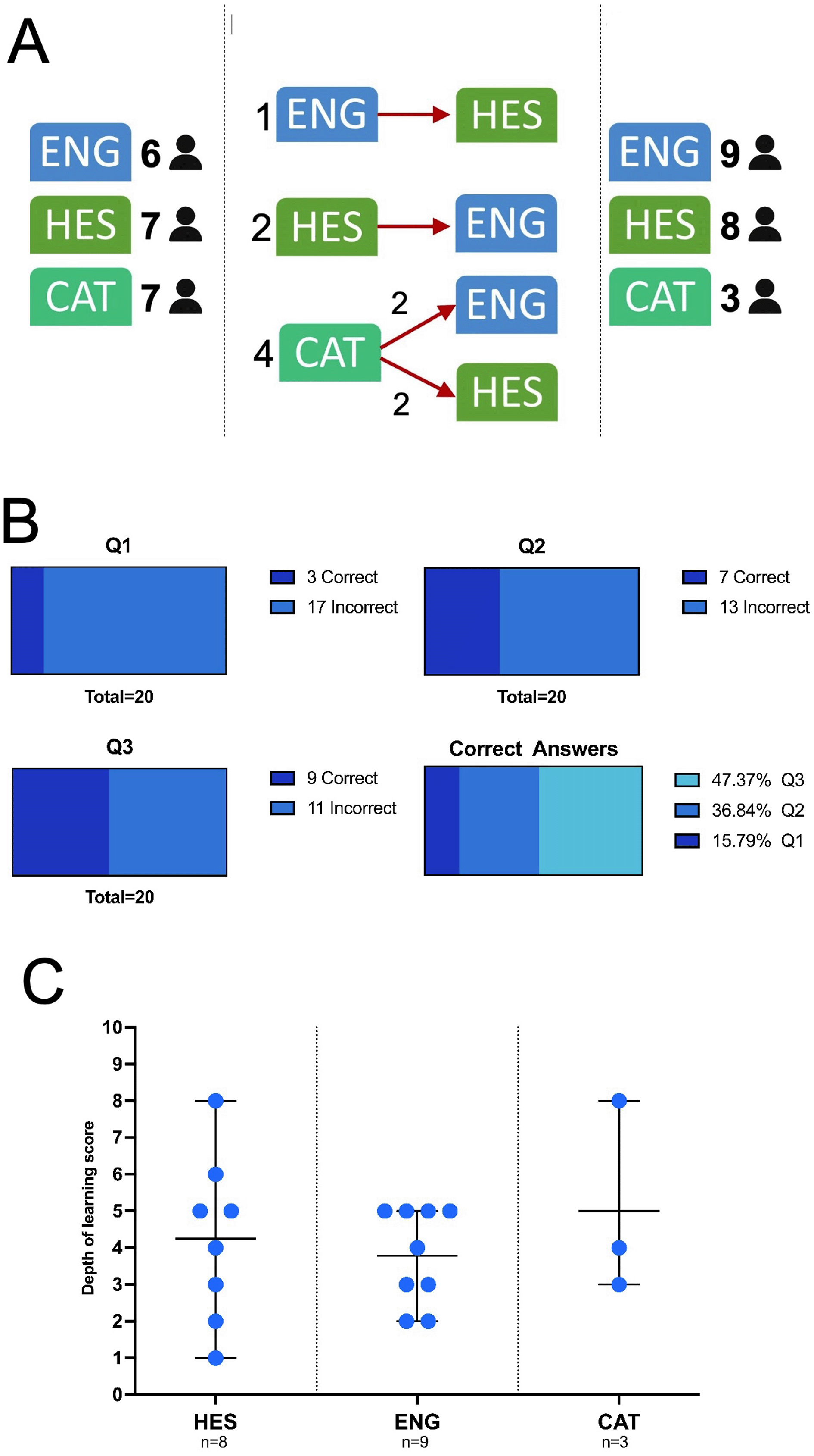 (A) Number of participants randomized in each group and participants’ migration towards a different group with final number of participants per group after migration, (B) Correct answers per question, (C) Depth of learning scores across language groups.