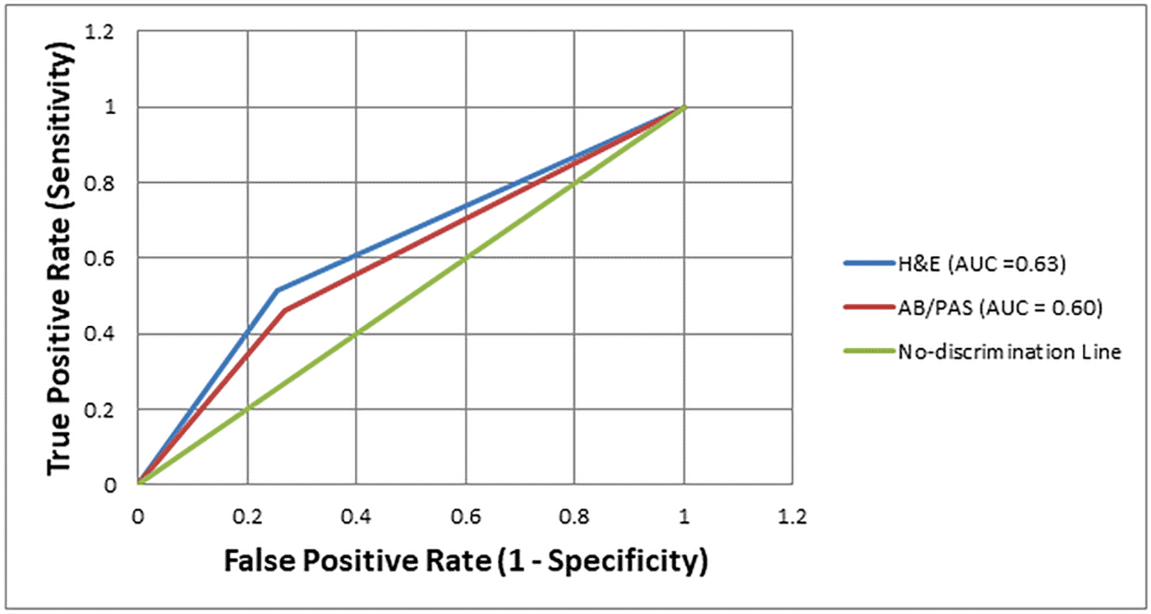 All statistical analyses were performed using IBM SPSS Statistics 25. (IBM Corp. Released 2023. IBM SPSS Statistics for Windows, Version 25. Armonk, NY: IBM Corp). To evaluate the diagnostic performance of the H&E and AB/PAS staining methods in detecting H. pylori, we constructed 2 × 2 contingency tables using the Giemsa stain as the reference standard. From these tables, we calculated sensitivity, specificity, positive predictive value (PPV), negative predictive value (NPV), and overall diagnostic accuracy for each method. In addition, Receiver Operating Characteristic (ROC) curve analysis was conducted to assess and compare the diagnostic performance of the staining techniques. The Area Under the Curve (AUC) was calculated for each method, providing a comprehensive measure that incorporates both sensitivity and specificity across all possible thresholds. AUC values were interpreted as follows: excellent (≥0.90), good (0.80–0.89), fair (0.70–0.79), and poor (<0.70). Differences in AUC values between stains were evaluated using DeLong’s test, with p-values < 0.05 considered statistically significant.