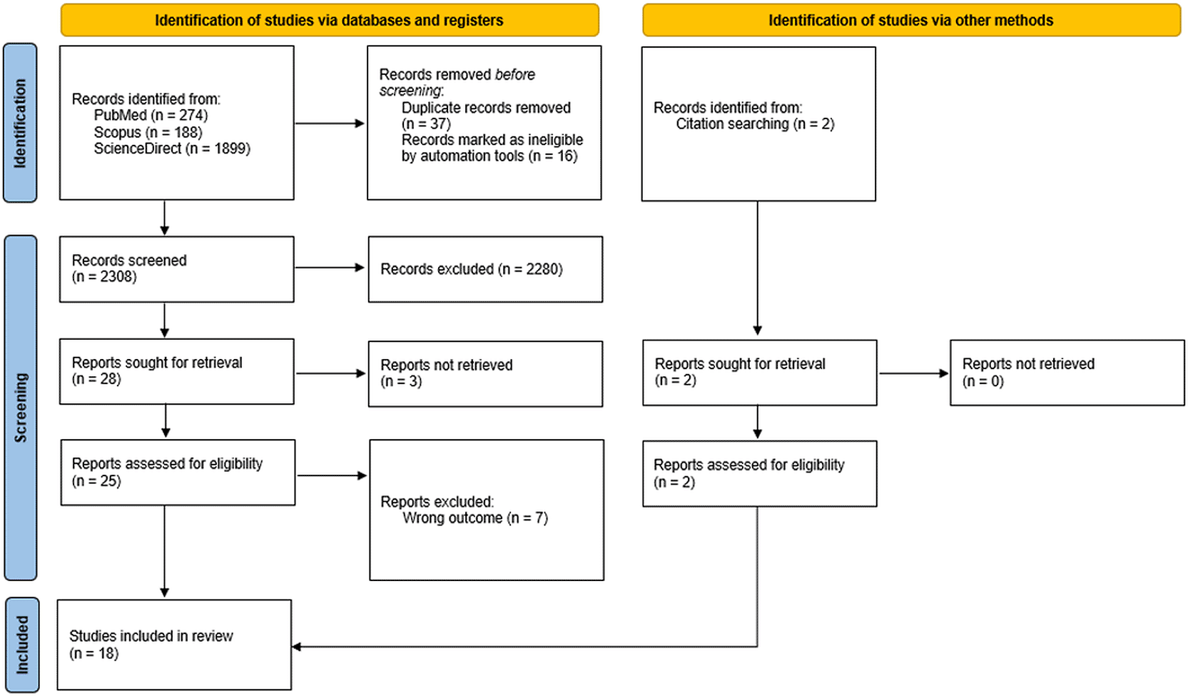 A total of 2,361 records were identified from electronic databases. After removing duplicates and ineligible records, followed by screening and full-text assessment, 18 articles were included in this study.10–27 Subsequent citation searching yielded two articles that were included in the current analysis. The complete screening process is outlined in the PRISMA flowchart ( Figure 1).