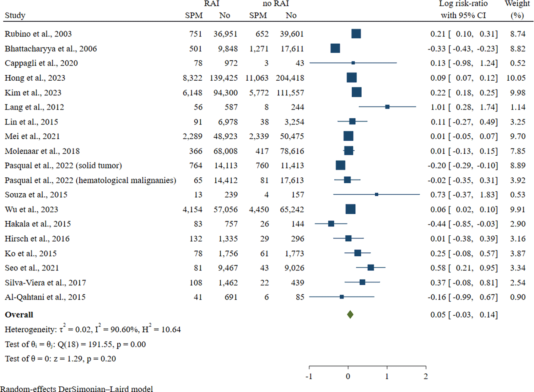 To date, only a limited number of meta-analyses have investigated the risk of SPM following RAI. For instance, Nappi et al. (2022) evaluated breast cancer as a second risk of cancer after RAI treatment and found no significant risk elevation.8 However, that study was limited to a single tumor site and did not assess overall SPM risk. No comprehensive meta-analysis has yet synthesized evidence across all non-thyroidal SPMs (both solid and hematologic) while accounting for these potential sources of variation. Herein, the present study aims to comprehensively estimate the pooled risk of SPM occurrence following RAI therapy.