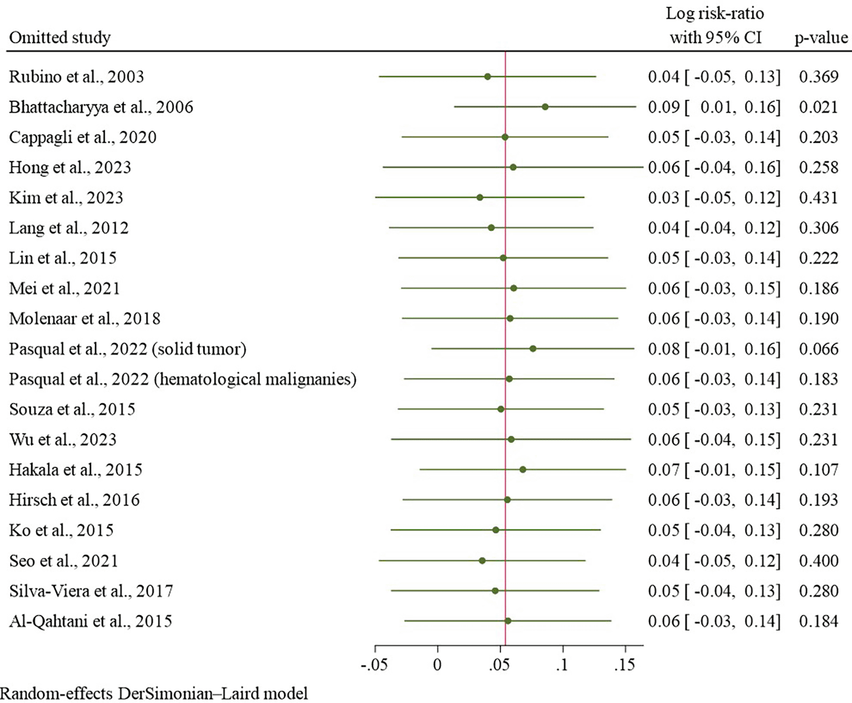 The pooled analysis revealed no statistically significant elevation in the risk of SPMs among the RAI-treated cohort. The pooled RR was calculated to be 1.07 (95% confidence interval: 0.96–1.21; p = 0.23), with substantial heterogeneity noted (I2 = 95.96%; see Figure 2). Leave-one-out sensitivity analysis yielded a robust result, as the sequential omission of each study resulted in a pooled logRR that remained consistent with all comparable p-values ( Figure 3).