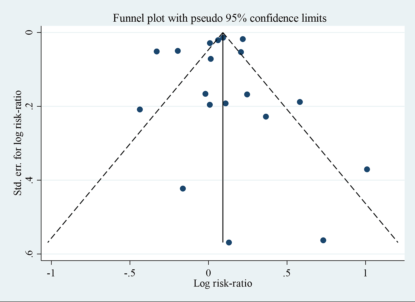 The evaluation of publication bias was conducted by creating a funnel plot and performing Egger’s regression test. The funnel plot indicated an approximately symmetrical distribution of effect sizes around the pooled estimate, with only minor deviations among studies that had larger standard errors, suggesting the absence of significant asymmetry (see Figure 4). Furthermore, Egger’s regression test did not indicate any evidence of small-study effects, with a bias coefficient of -0.53 (95% CI: -2.66 to 1.60; p = 0.609).