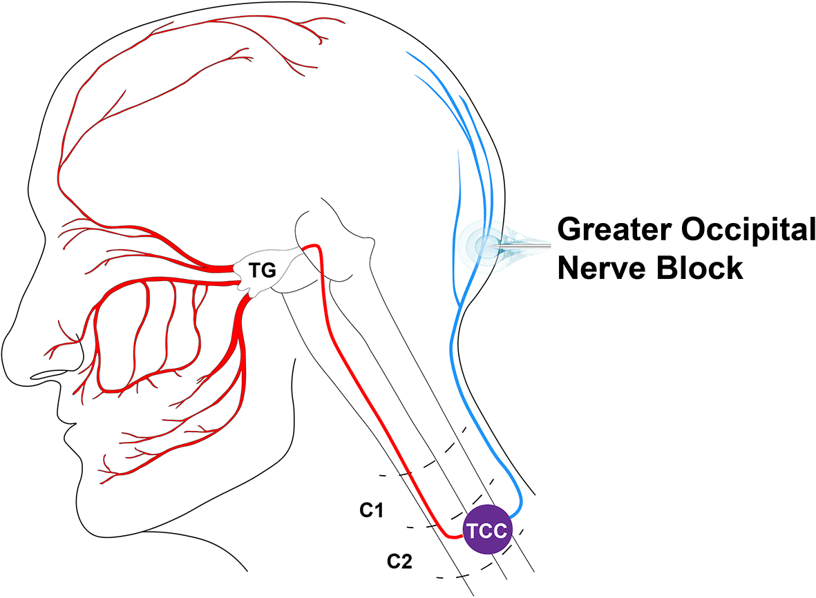 Together, these nerves provide sensory innervation to the entire head and are functionally coupled within the trigeminocervical complex (TCC). A needle illustration indicates the approximate segment of the greater occipital nerve targeted by conventional GON blocks and by the CryoGON procedure. Bilateral treatment (not shown) is performed for both interventions.