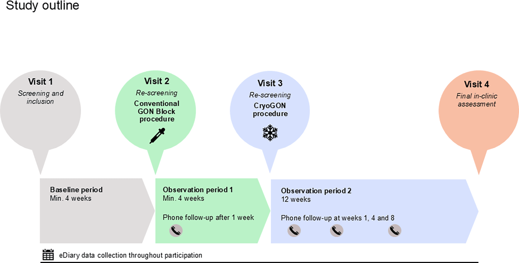The study will comprise four in-clinic visits and a series of structured follow-up contacts, separated by observation periods with prospective daily eDiary data collection (Figure 2). At visit 1, eligibility will be assessed and written informed consent obtained via an electronic signature in a secure institutional digital platform (the eFORSK platform). Eligible participants will then enter a minimum 28-day baseline period, which serves both as a screening phase and to establish baseline data for endpoint assessments. A diary adherence of at least 90% (≥25 of 28 days) will be required to proceed. At visit 2, participants will be re-screened, and those meeting criteria will receive bilateral conventional greater occipital nerve (GON) blocks followed by a minimum 28-day observation period. A structured telephone call will be conducted one week after the procedure to capture any treatment-emergent adverse events and confirm scheduling for visit 3. At visit 3, eligibility will again be reassessed, including review of contraindications to CryoGON, confirmation of ≥90% diary adherence, and stable prophylactic regimens. Participants meeting criteria will undergo the CryoGON procedure (navigation-guided cryoneurolysis of the GON). Structured telephone follow-ups will be performed at weeks 1, 4, and 8, and a final in-clinic assessment will be conducted at week 12 post-CryoGON.