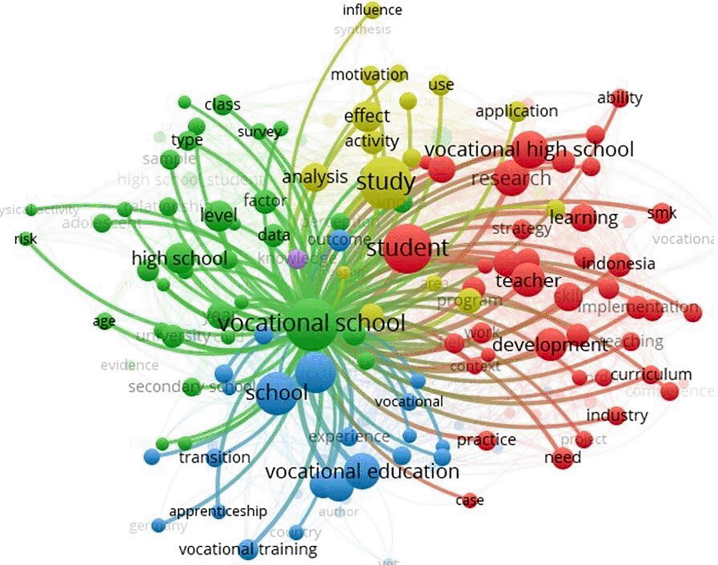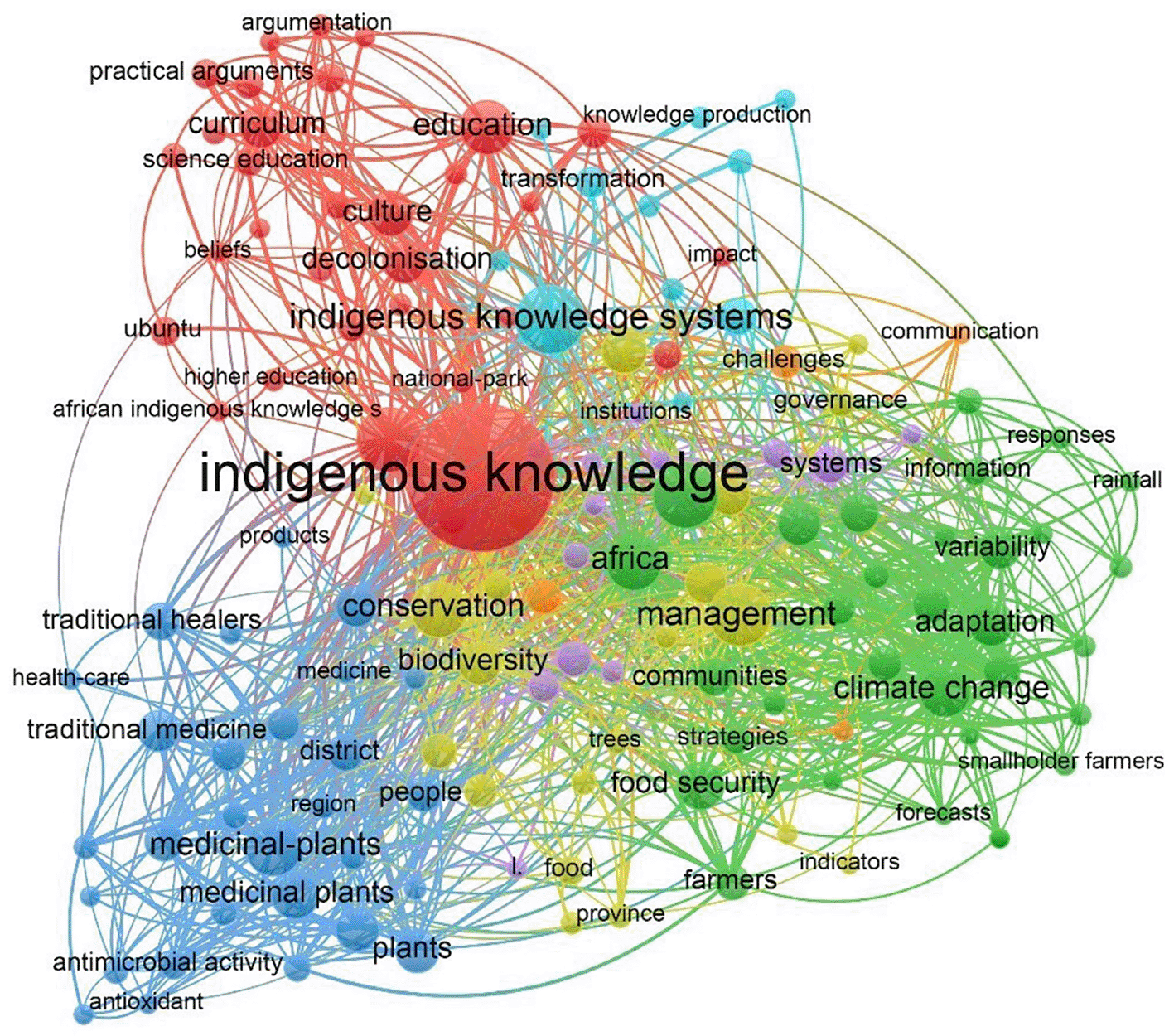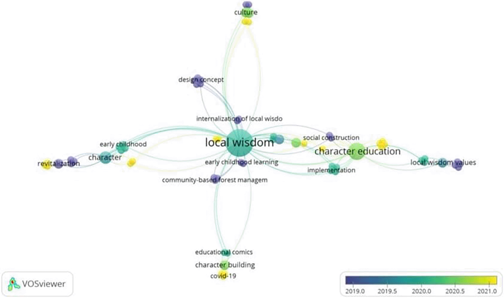 The distribution of research themes related to vocational education in Indonesia is illustrated in Figure 1. It highlights the major nodes representing frequently co-occurring keywords within the reviewed literature, showing the relational strength between terms such as vocational school, student, teacher, curriculum, and development. Figure 2 illustrates the global distribution and thematic clusters of research on indigenous knowledge, highlighting the interconnections between cultural, educational, and environmental dimensions of indigenous studies. Figure 3 presents the keyword co-occurrence network related to local wisdom within the educational context, emphasizing its intersection with culture, character education, and community-based learning
